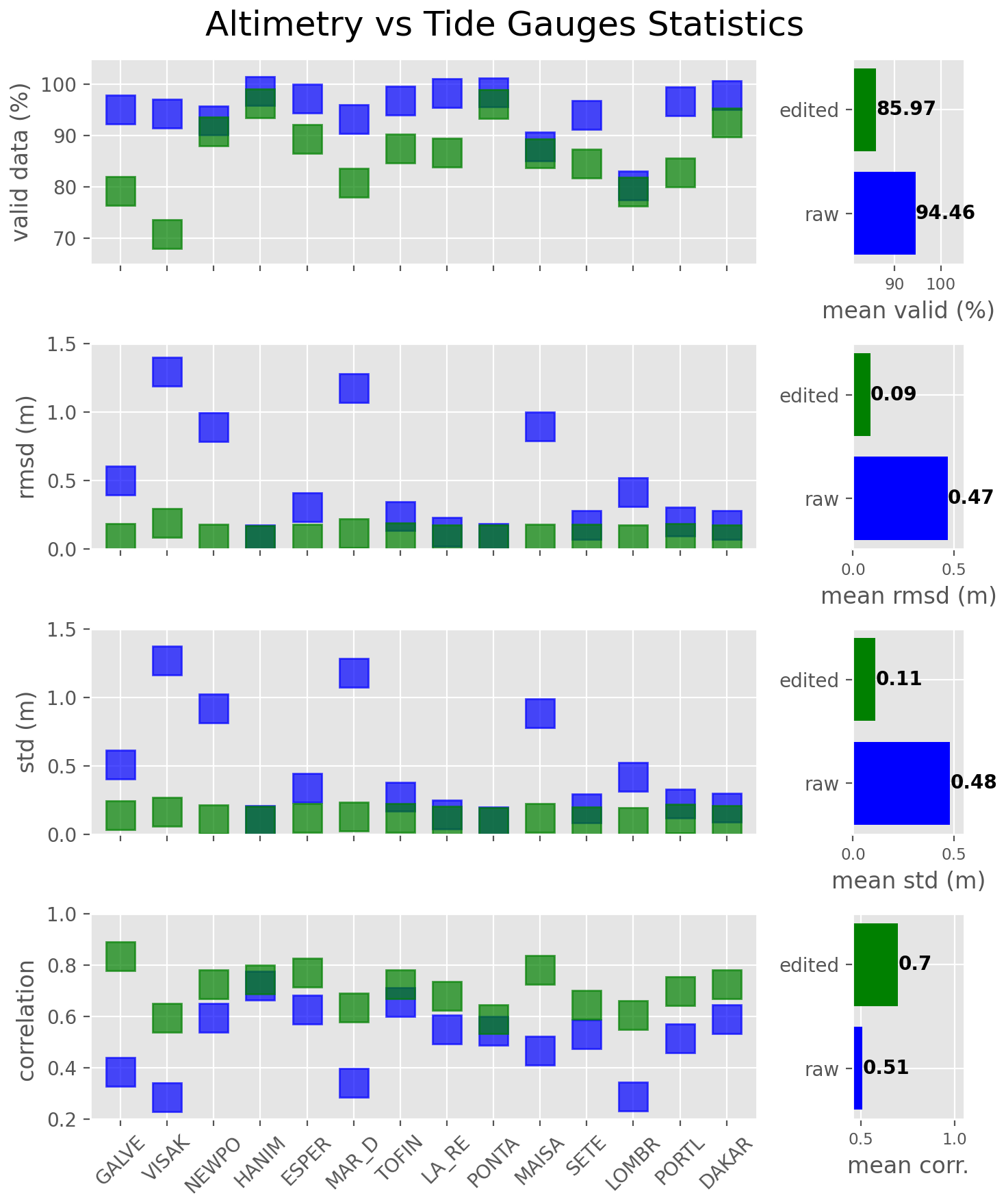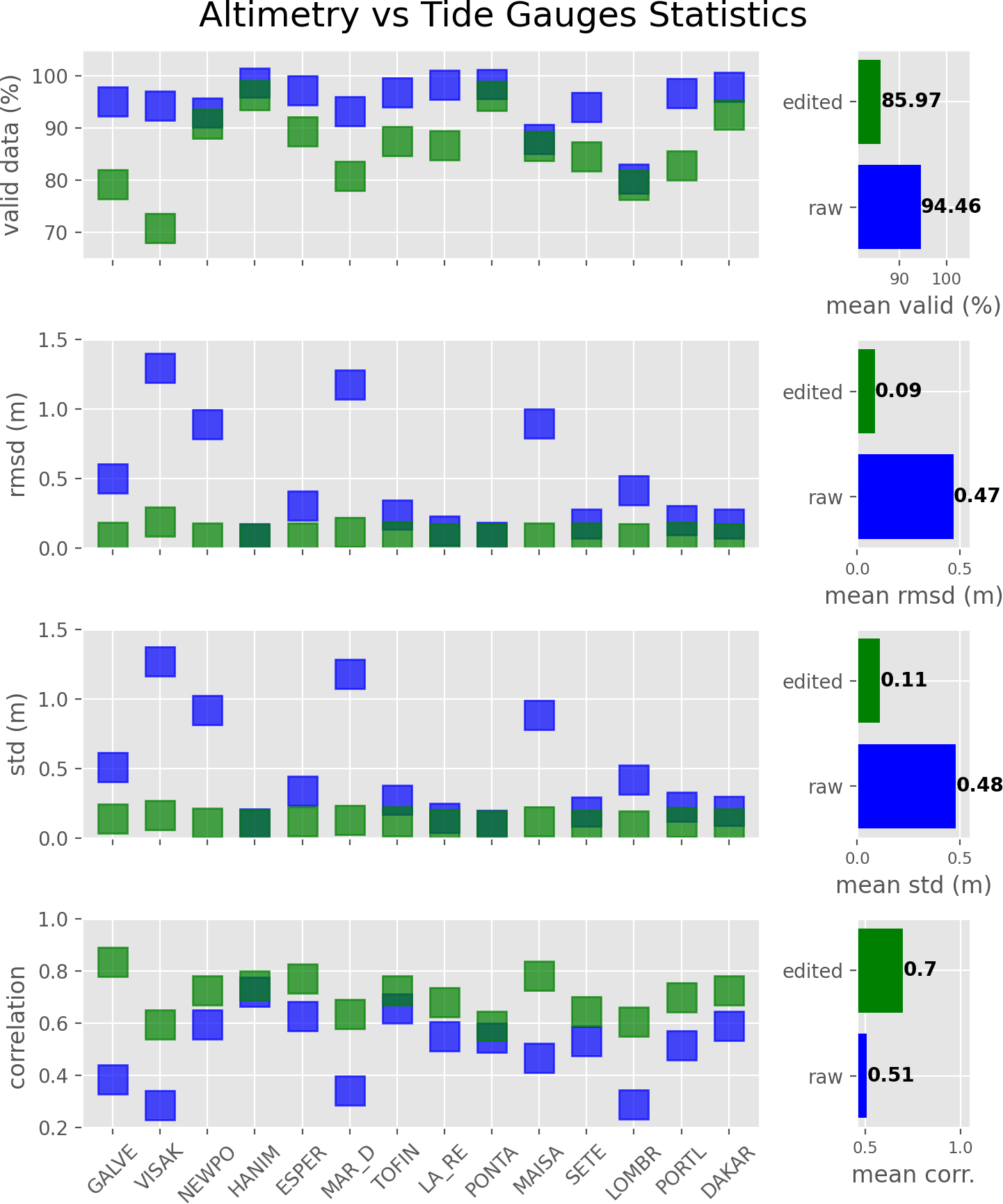 Figure 4Mean statistics from the comparison between the raw (blue) and edited (green) SLAs of the ALTICAP product and the selected tide gauges (for brevity, only the first 5 letters of the names are shown). The statistics have been computed for each altimetry point located at less than 20 km from the coast and less than 50 km from the tide gauge station, and then averaged for each tide gauge. They are presented for each tide gauge (left panels) and then averaged on a global scale (right panels).