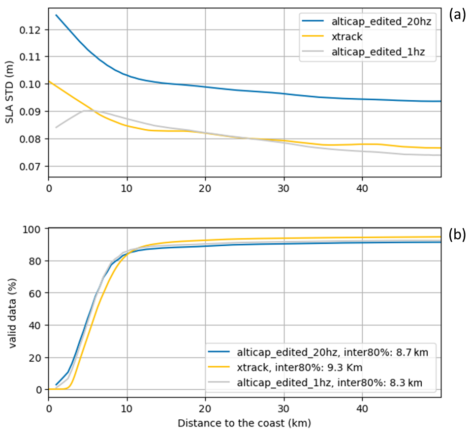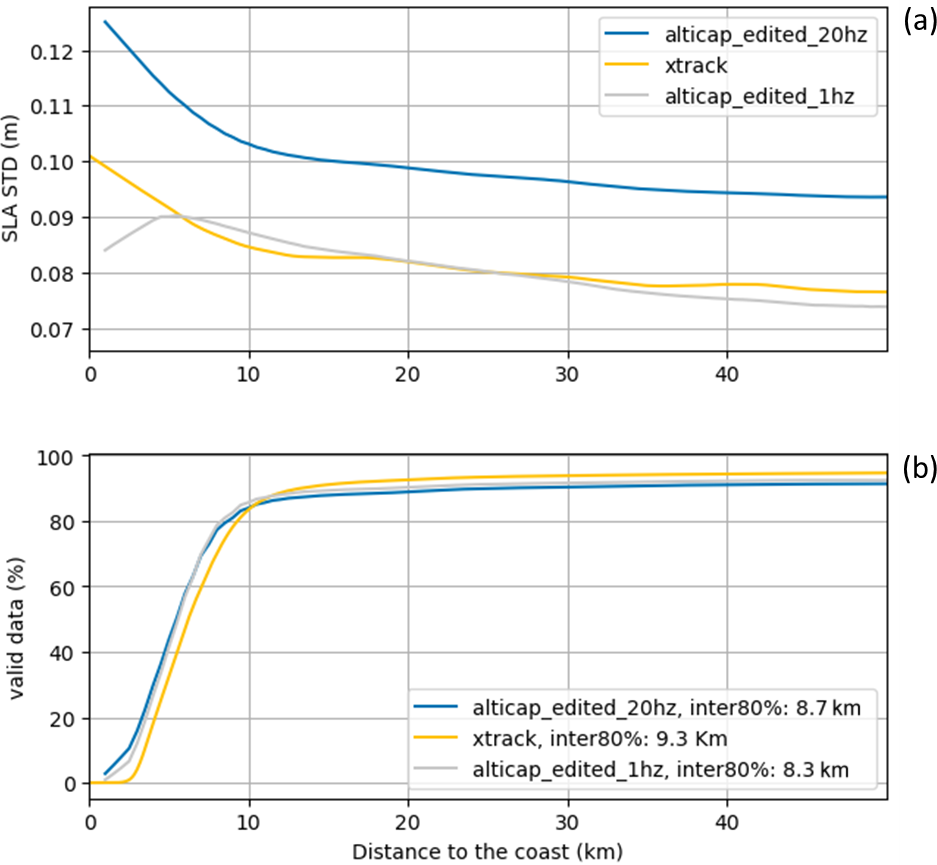 Figure 5Standard deviation in meters (a) and percentage of valid data (b) as a function of the distance to the coast for the X-TRACK SLAs (blue), the edited 20 Hz ALTICAP SLAs (orange) and the edited 20 point averaged ALTICAP SLAs (grey). Inter80 % refers to the distance to the coast at which 80 % of valid data availability is obtained.