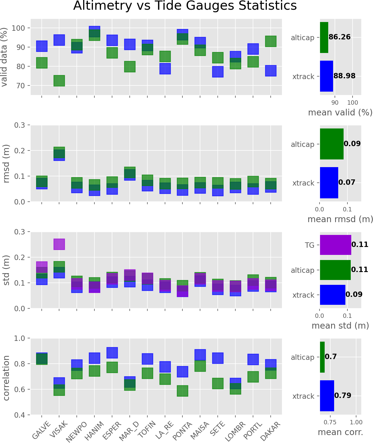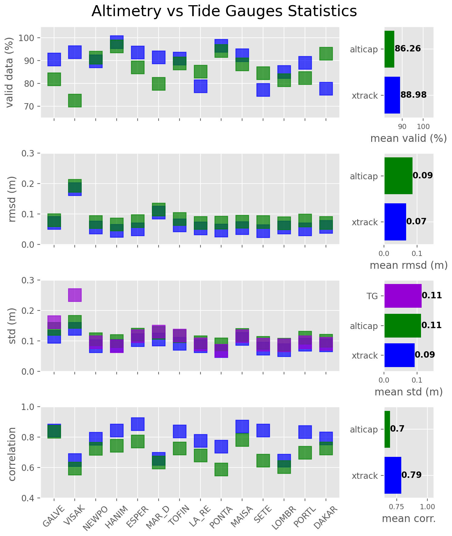 Figure 7Mean statistics from the comparison between the edited ALTICAP (green) and X-TRACK (blue) SLAs and the selected tide gauges (for brevity, only the first 5 letters of the names are shown). The statistics have been computed for each altimetry point located at less than 20 km from the coast and less than 50 km from the tide gauge station and then averaged for each tide gauge. They are represented by tide gauge (left panels) and then averaged on a global scale (right panels). The standard deviation of the tide gauge SLA is also shown in purple.