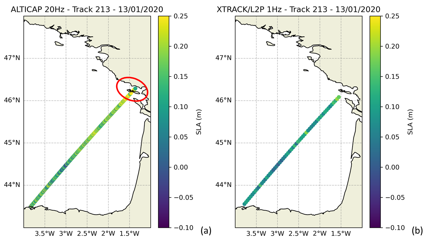 Figure 8SLA (in meters) from the edited ALTICAP 20 Hz product (a) and the X-TRACK 1 Hz product (b) along the Jason-3 track 213, for cycle 142 (13 January 2020) in the Bay of Biscay (French Atlantic coast). The area of the Pertuis Charentais where the ALTICAP product brings additional data compared to the X-TRACK product is encircled in red.