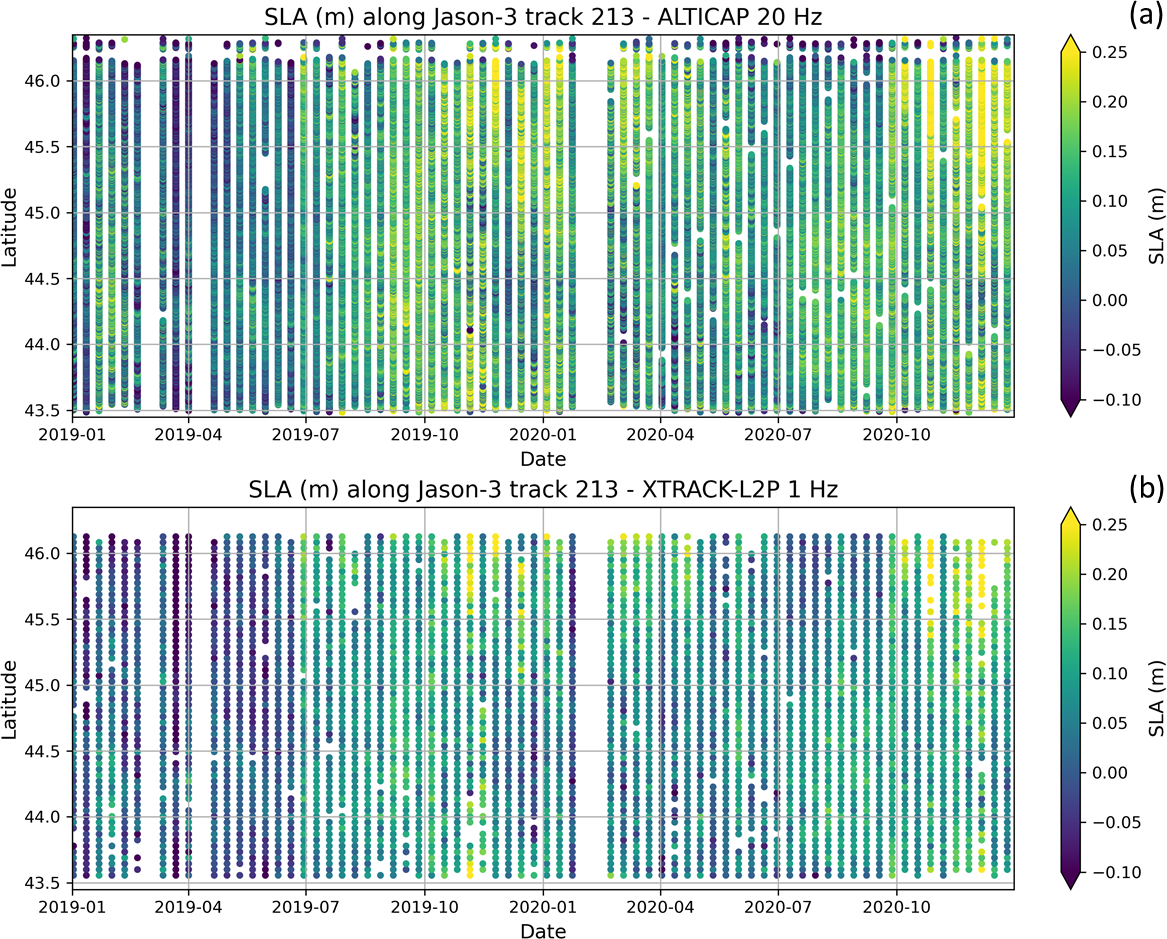 For validation purposes, ALTICAP SLA time series are compared with those of an equivalent coastal sea level product. From the two most popular products mentioned above, we have chosen X-TRACK (CTOH, 2023; Birol et al., 2017) since it is the closest in terms of content. It is also the most widely used in coastal studies, with over 170 publications. X-TRACK is a Level-3 product, which means that along track SLA are projected onto reference ground-tracks. It is computed by LEGOS/CTOH starting from the Level-2 Plus (L2P) CNES products. More than 30 years of data are available and are distributed by AVISO+. X-TRACK is a 1-Hz product (i.e., with a 6 to 7 km posting rate) and has then a coarser spatial resolution than ALTICAP (20 Hz, i.e., 350 m posting rate) in the along-track direction. Given that the ALTICAP dataset only includes data from the Jason-3 mission from February 2016 to July 2021 (at the time of writing), all the following comparisons described in Sect. 3.3 are only performed over this period.
