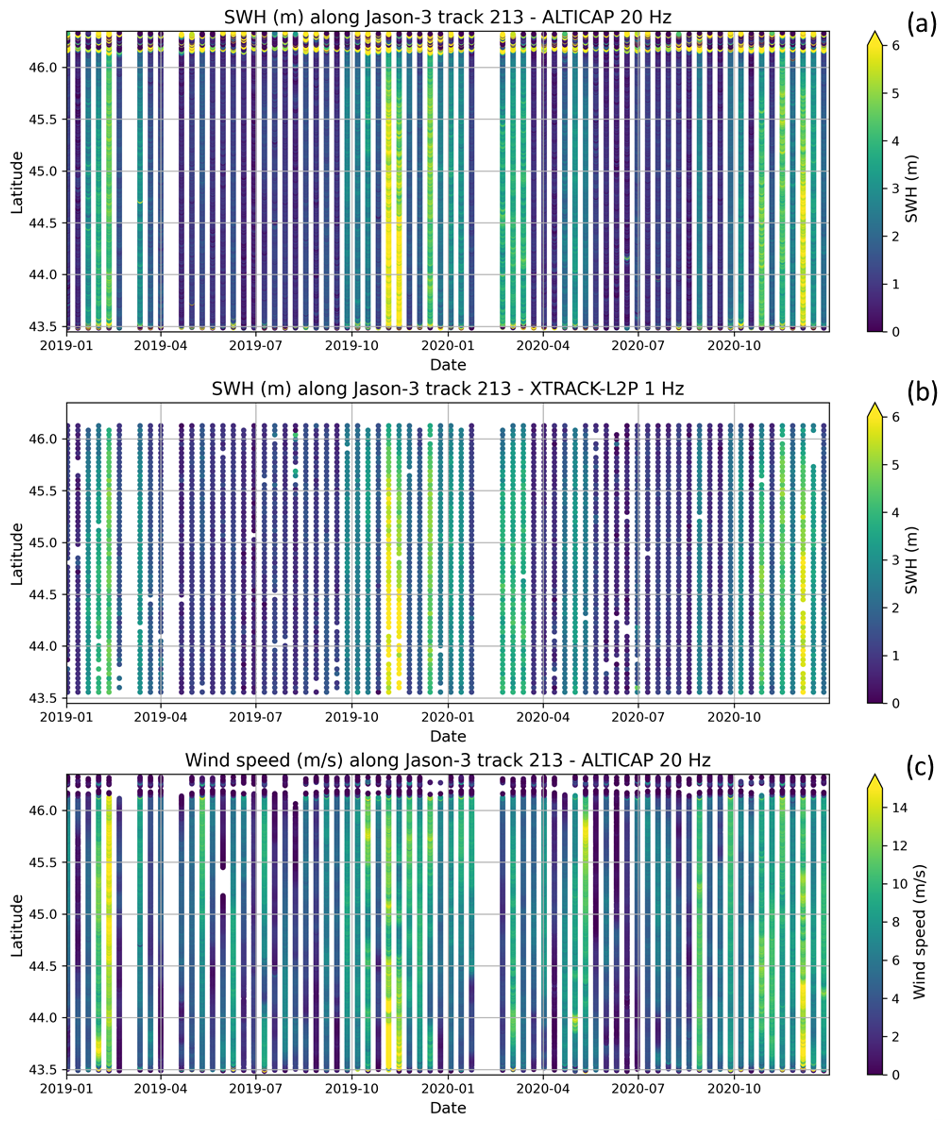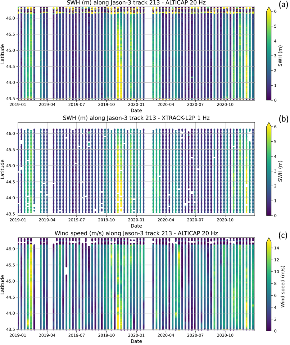 Figure 10Time-latitude diagrams of the Significant Wave Heights (SWH) from the X-TRACK 1 Hz product (a) and the ALTICAP 20 Hz product (b), and wind speed from the ALTICAP 20 Hz product (c), along the Jason-3 track 213 in the Bay of Biscay, for the time period 2019–2020.