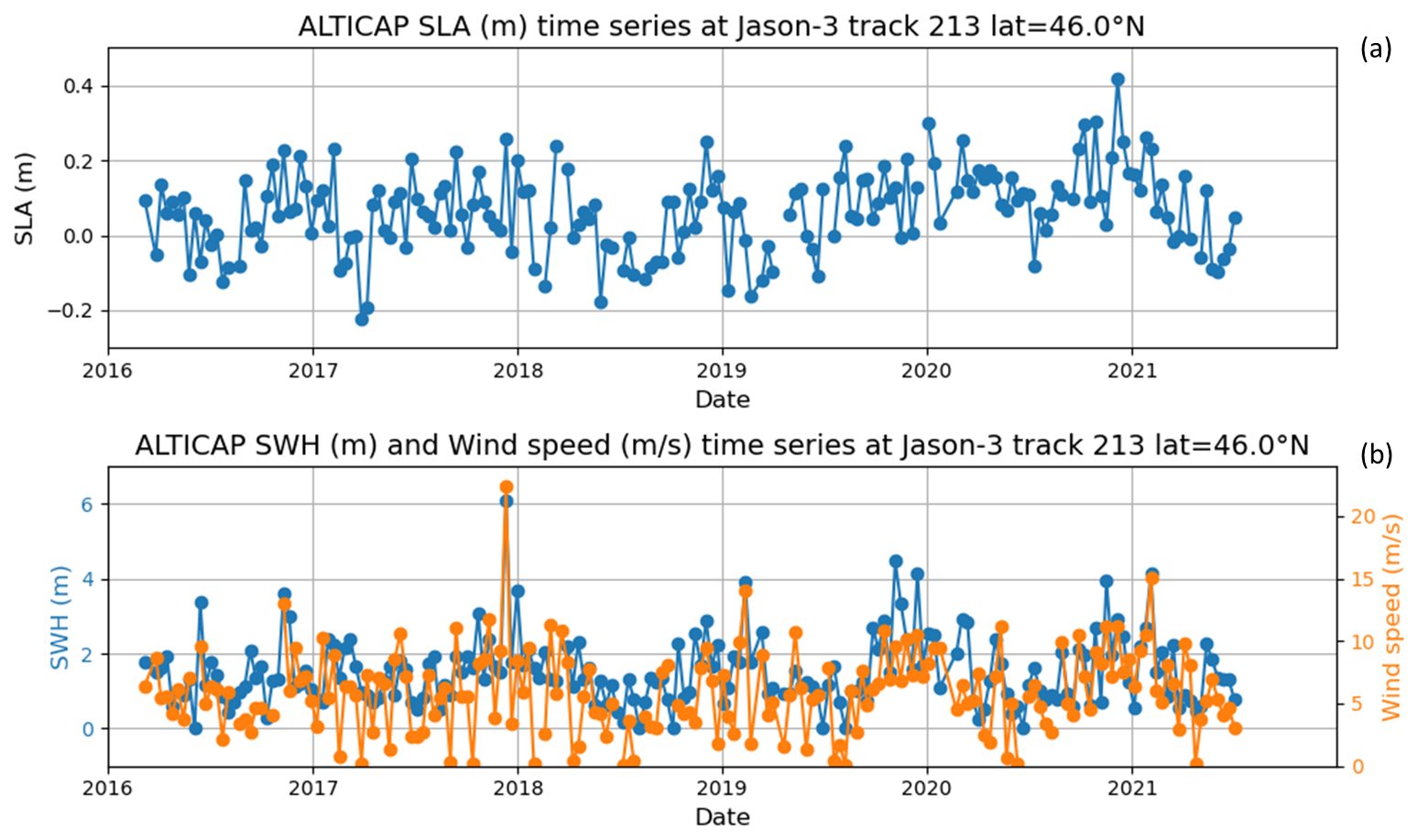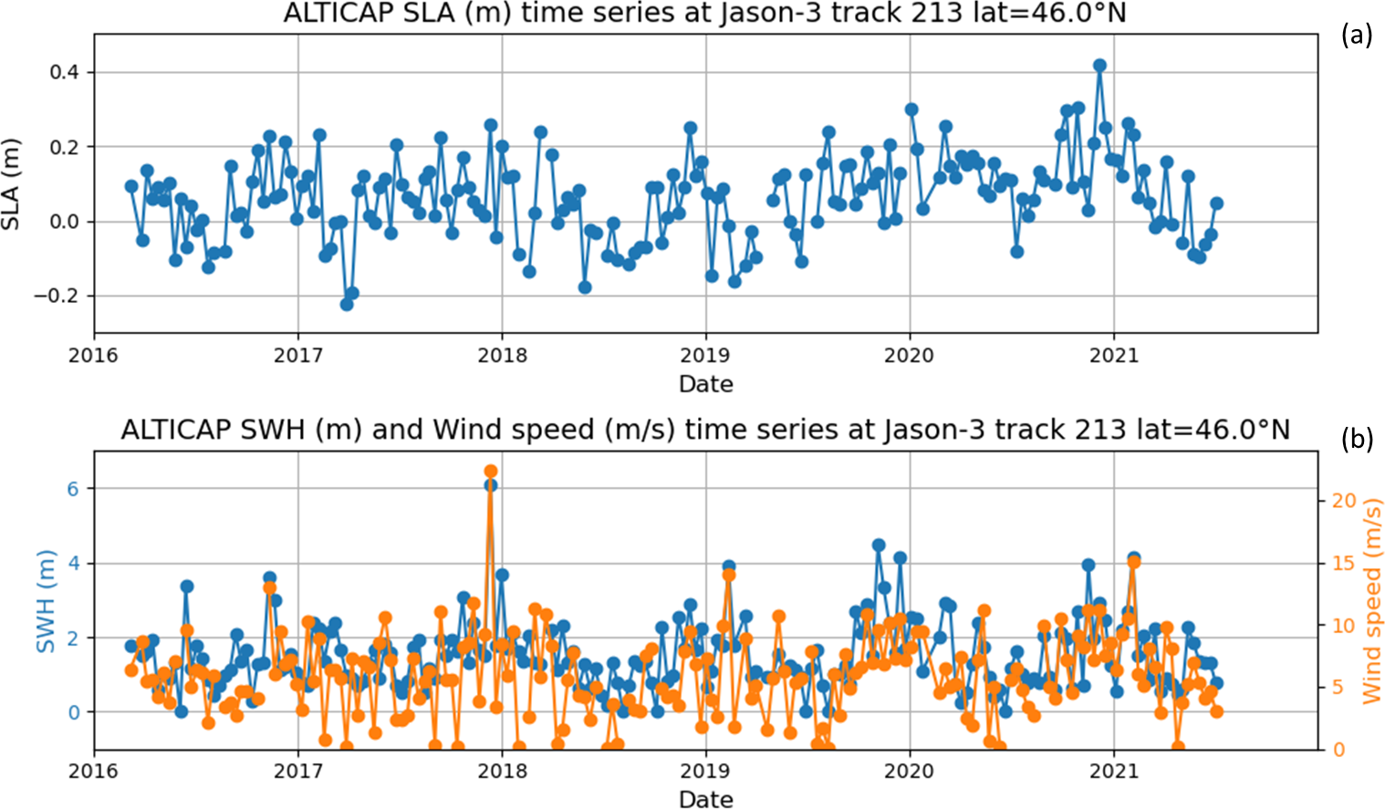 Figure 11Time series of (a) SLAs and (b) Significant Wave Heights (SWH) and Wind speeds from the ALTICAP 20 Hz product at one point (latitude = 46.0° N) of the Jason-3 track 213 in the Bay of Biscay, for the whole time period available (2016–2021). The SWHs larger than 10 m have been edited for the plot.