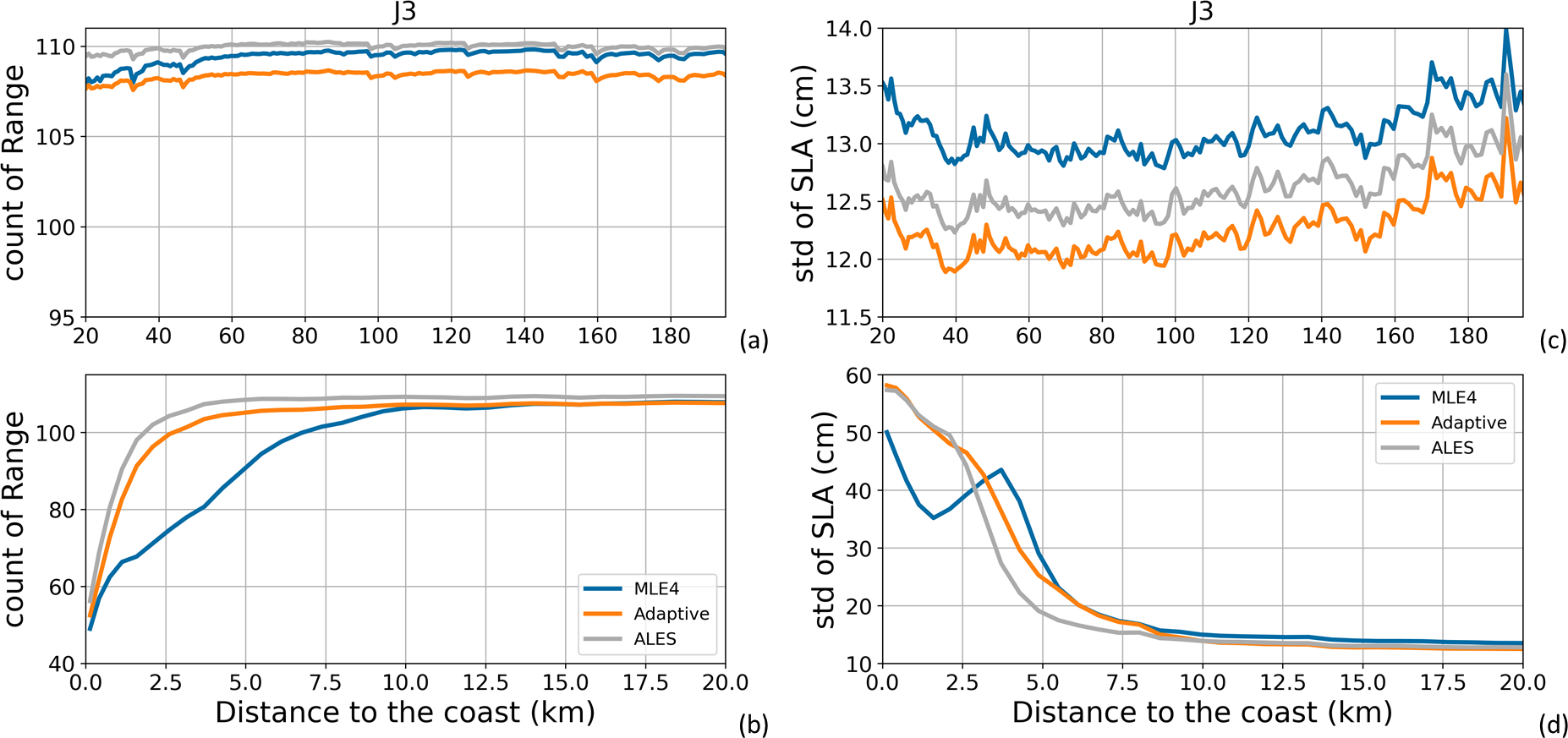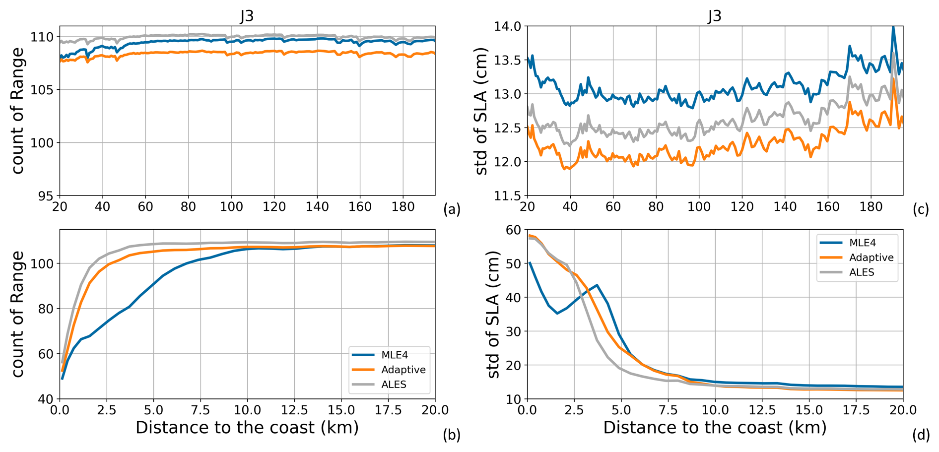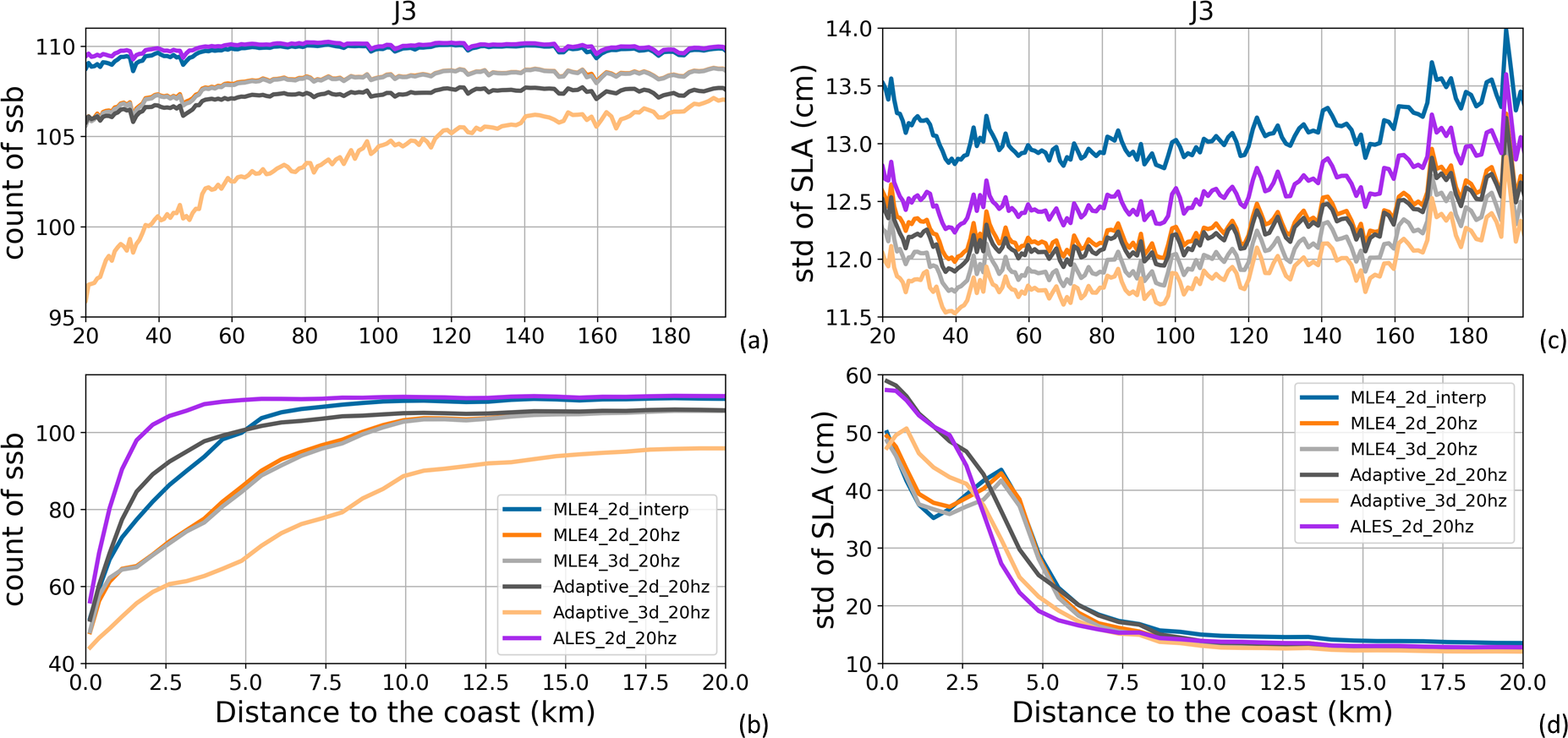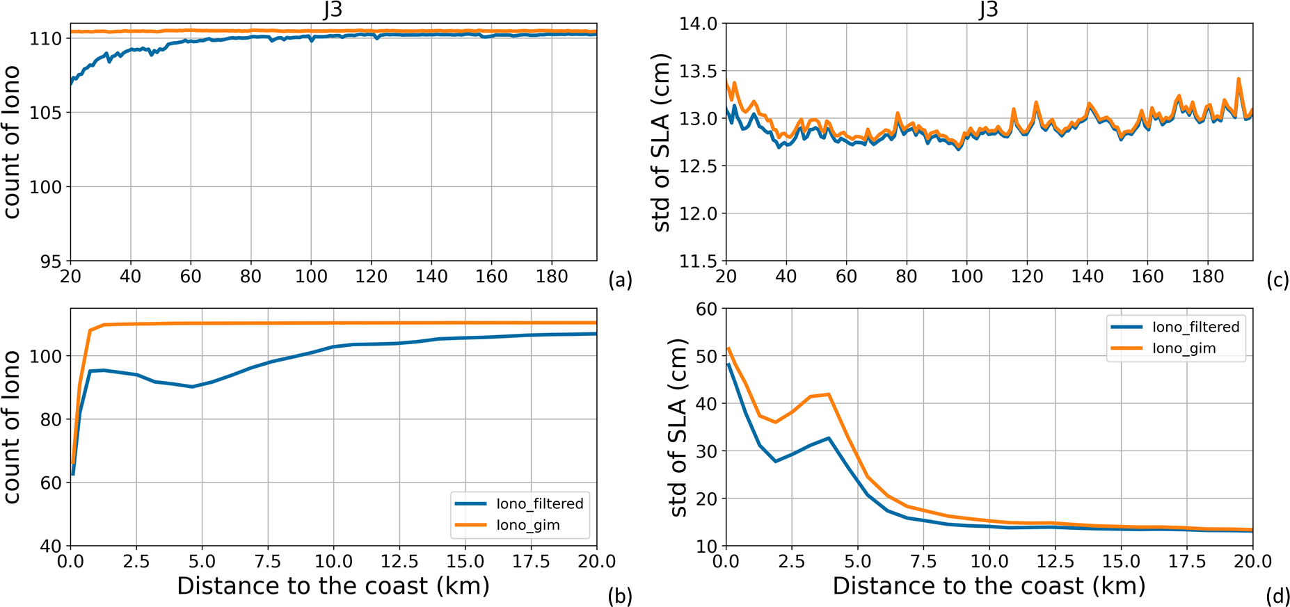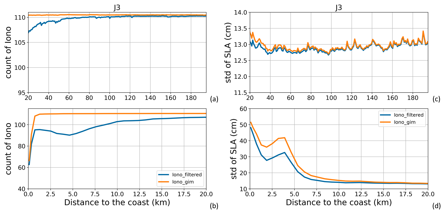 Figure A3(a, b) Global mean number of valid ionospheric correction data along all Jason-3 tracks for the period 17 February 2016 to 22 February 2019 (111 cycles). (c, d) Global mean of standard deviation values (in cm) of the SLA along all Jason-3 tracks for the same period, when using the different ionospheric correction solutions. Results are presented as a function of the distance to the coast (in km) between 200 and 20 km (a, c) and between 20 and 0 km (b, d) from the coast.