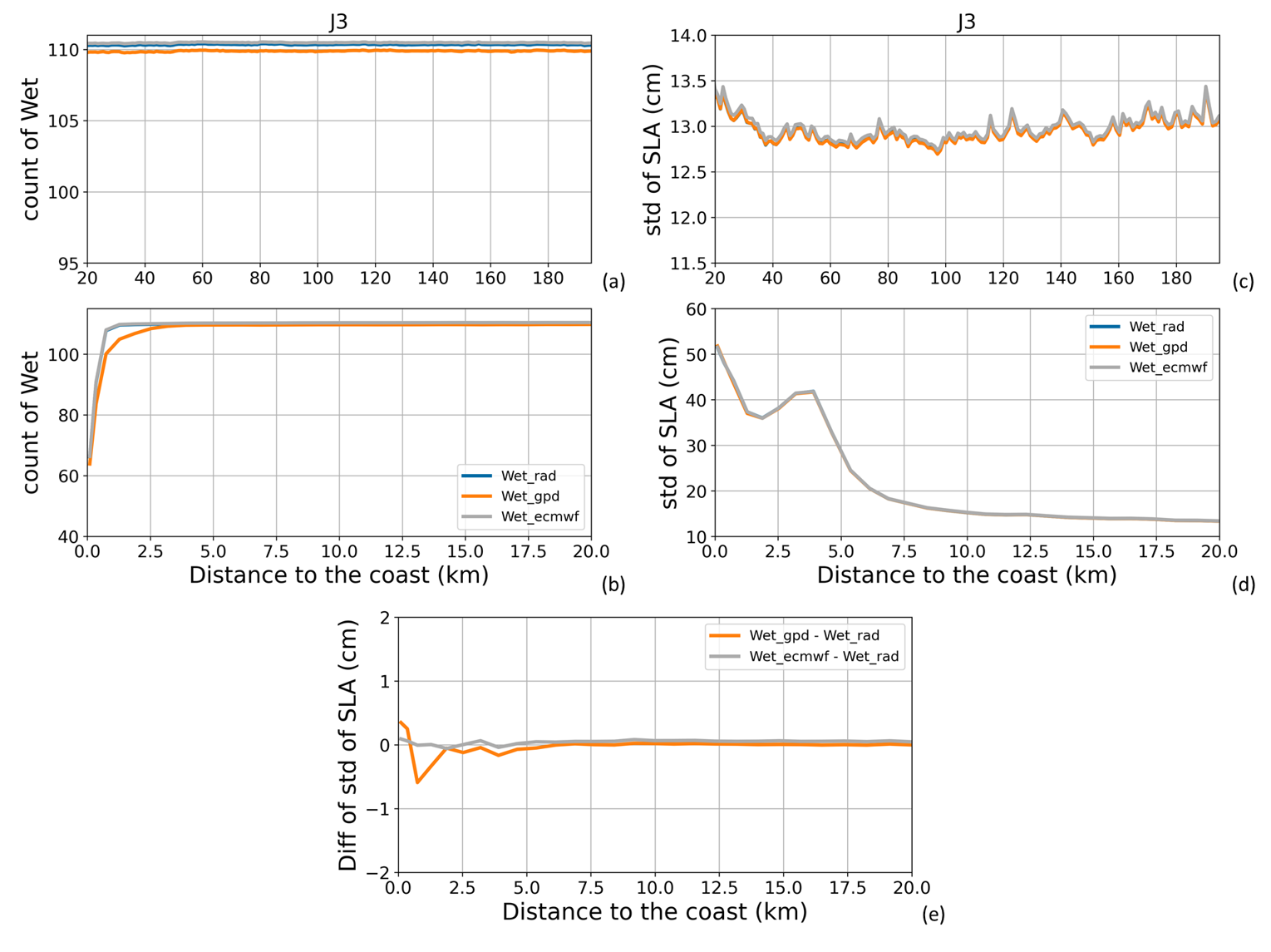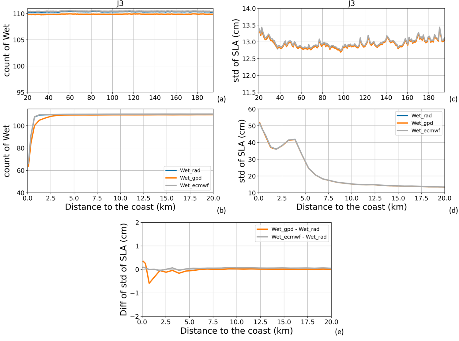 Figure A4(a, b) Global mean number of valid wet tropospheric correction data along all Jason-3 tracks for the period 17 February 2016 to 22 February 2019 (111 cycles). (c, d) Global mean of standard deviation values (in cm) of the SLA along all Jason-3 tracks for the same period, when using the different wet tropospheric correction solutions. (e) Difference (in cm) between the global mean of standard deviation values of the SLA along all Jason-3 tracks for the same period, when using the different wet tropospheric solutions and when using the reference solution (radiometer). Results are presented as a function of the distance to the coast (in km) between 200 and 20 km (a, c) and between 20 and 0 km (b–e) from the coast.