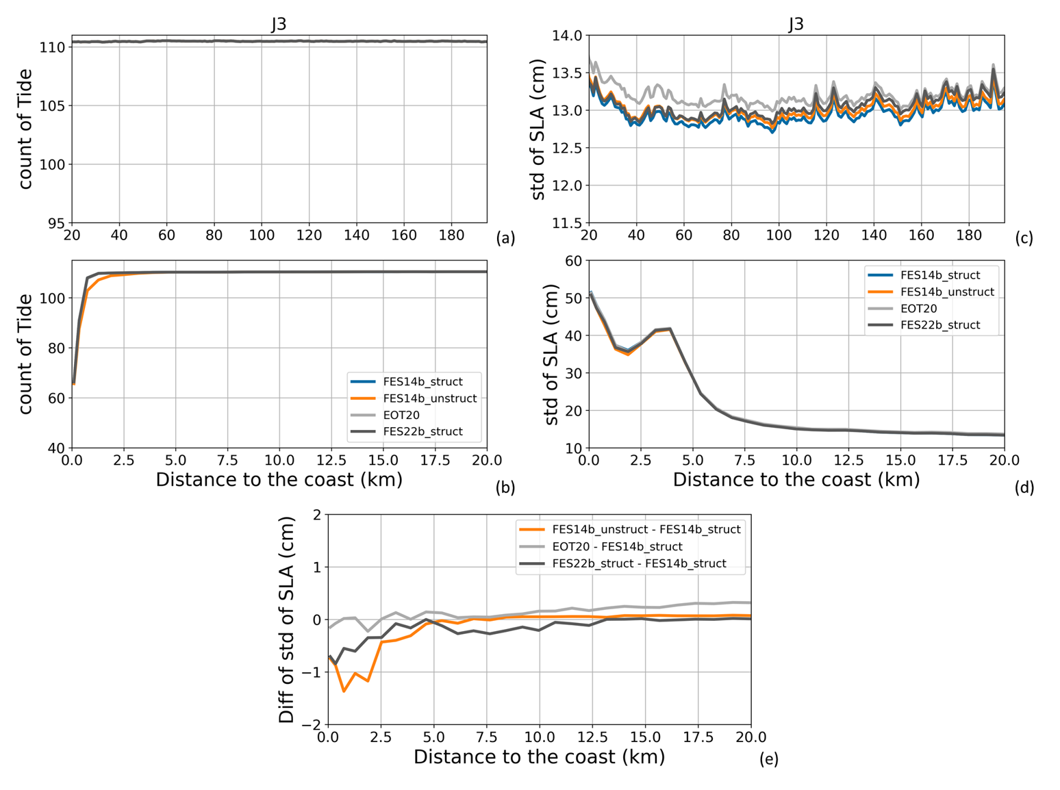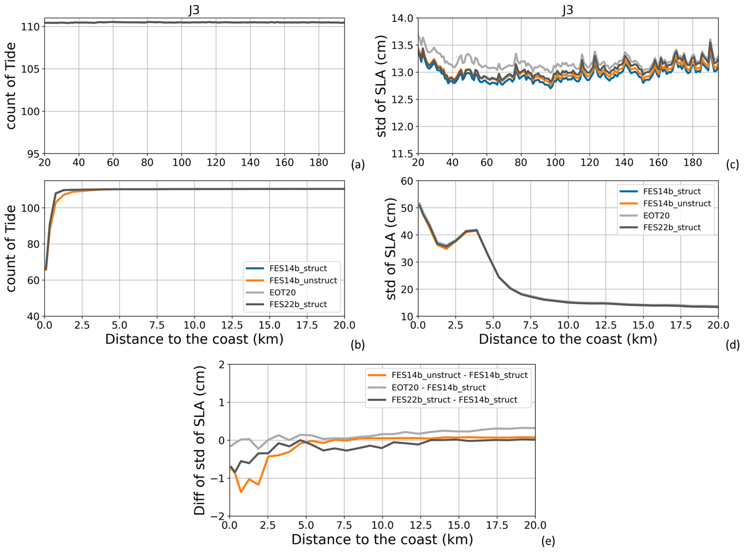 Figure A5(a, b) Global mean number of valid ocean tide correction data along all Jason-3 tracks for the period 17 February 2016 to 22 February 2019 (111 cycles). (c, d) Global mean of standard deviation values (in cm) of the SLA along all Jason-3 tracks for the same period, when using the different ocean tide correction solutions. (e) Difference (in cm) between the global mean of standard deviation values of the SLA along all Jason-3 tracks for the same period, when using the different tide solutions and when using the reference solution (FES2014b struct). Results are presented as a function of the distance to the coast (in km) between 200 and 20 km (a, c) and between 20 and 0 km (b–e) from the coast.
