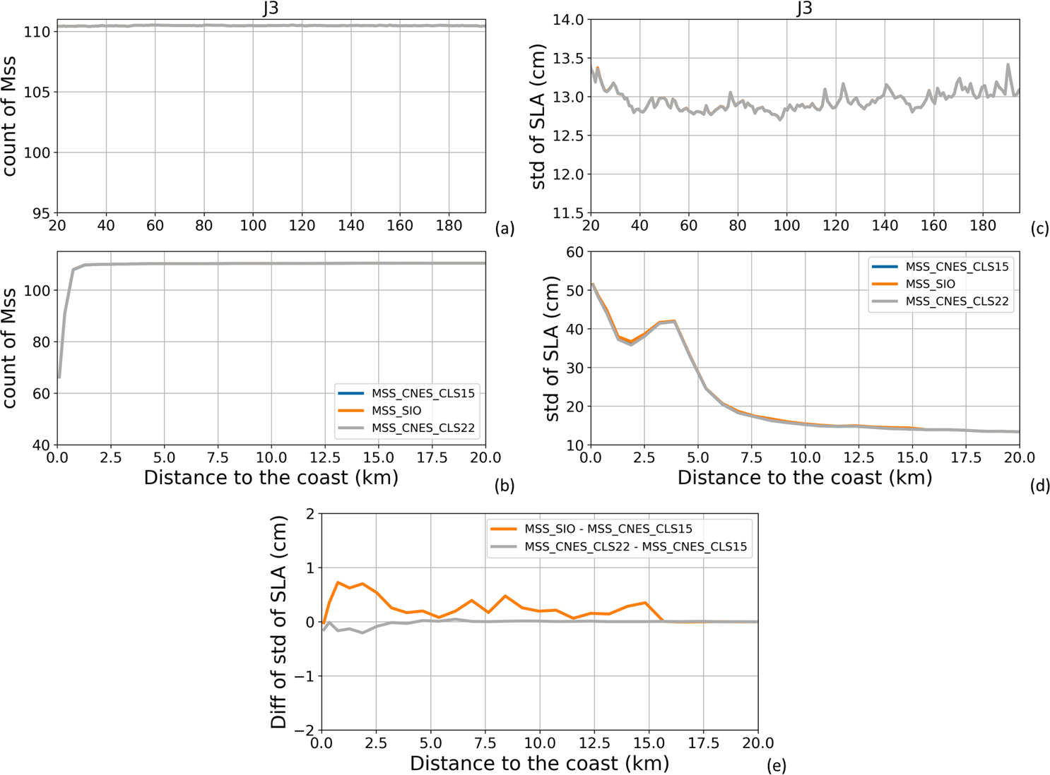 Figure A6(a, b) Global mean number of valid MSSH data along all Jason-3 tracks for the period 17 February 2016 to 22 February 2019 (111 cycles). (c, d) Global mean of standard deviation values (in cm) of the SLA along all Jason-3 tracks for the same period, when using the different MSSH solutions. (e) Difference (in cm) between the global mean of standard deviation values of the SLA along all Jason-3 tracks for the same period, when using the different MSSH solutions and when using the reference solution (CNES-CLS15). Results are presented as a function of the distance to the coast (in km) between 200 and 20 km (a, c) and between 20 and 0 km (b–e) from the coast.