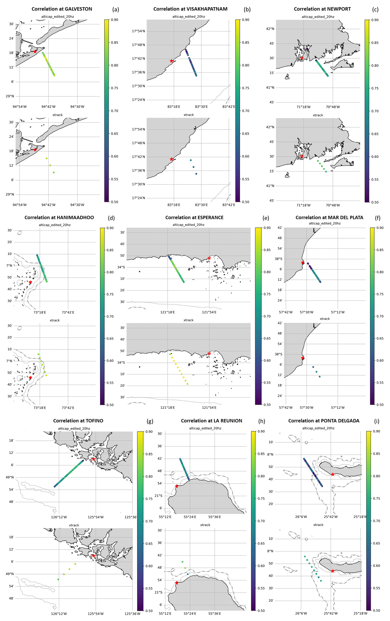 The selected tide gauges present a large diversity of configurations, with relatively straight coastlines (e.g., Esperance, Sète, La Réunion and Ponta Delgada) or very indented coastlines (e.g., Newport and Tofino). In some cases, the tide gauge is located in a harbor (e.g., Galveston, Newport, Mar del Plata, Maisaka, Dakar) or in an estuary (e.g., Visakhapatnam) and may thus see rather different dynamics than the altimetry track on the open ocean. Sometimes, there is an island or an island chain between the tide gauge and the altimetry track (e.g., Galveston, Newport, Hanimaadhoo, Tofino, Lombrum), and the ocean dynamics may be very different on each side of the island. However, no generic conclusions can be drawn for each type of configuration, as the results are very contrasted and strongly depend on the main drivers of the local ocean dynamics. For example, although the Galveston tide gauge is located in a harbor, in a narrow channel, and behind an island, the correlations with altimetry are very high (>0.8) because the main process in the region (Gulf of Mexico) is the steric effect. Lower correlations at some other places can be explain by very local dynamics, once the tides and wind and atmospheric pressure effects are removed from the SLAs in the observations.