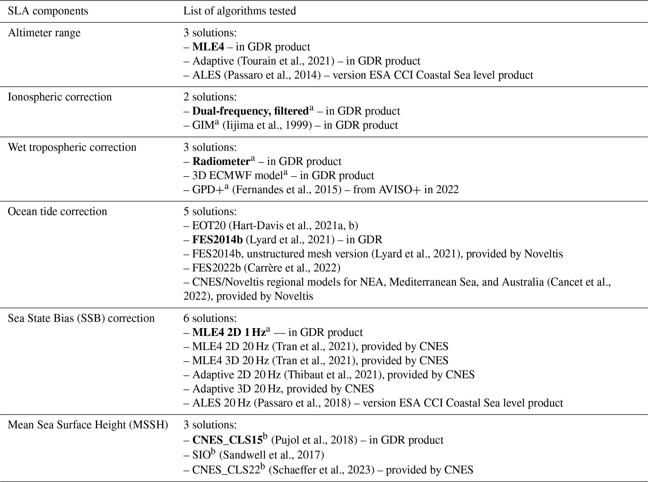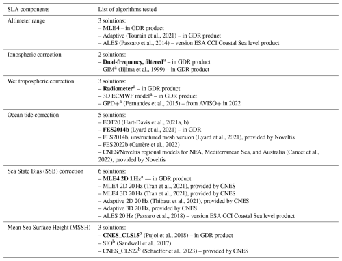 Table 1SLA components included in the round robin exercise (column 1), with the list of algorithms tested for each one (column 2). The reference algorithms currently used in operational sea level products for each component are in bold. The fields marked with a were provided at 1 Hz only and have been linearly interpolated to 20 Hz for the purposes of this study; the fields marked with b have been specifically interpolated at 20 Hz from the native grids for this study; the others were at 20 Hz. GDR is the official Geophysical Data Record product distributed by the space agencies (version D for Jason-2 and version F for Jason-3).