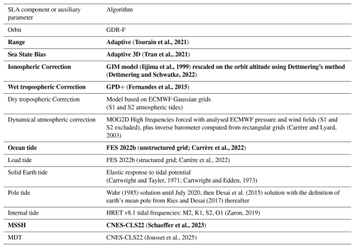 The final choice of algorithms used to compute the ALTICAP SLA dataset is summarized in Table 2. The SLA components selected in the context of the round robin, following all the criteria described in Sect. 2.1, are indicated in bold. The other parameters correspond to the environmental and geophysical altimetry corrections that were not included in the round robin but need to be applied to the SLA.