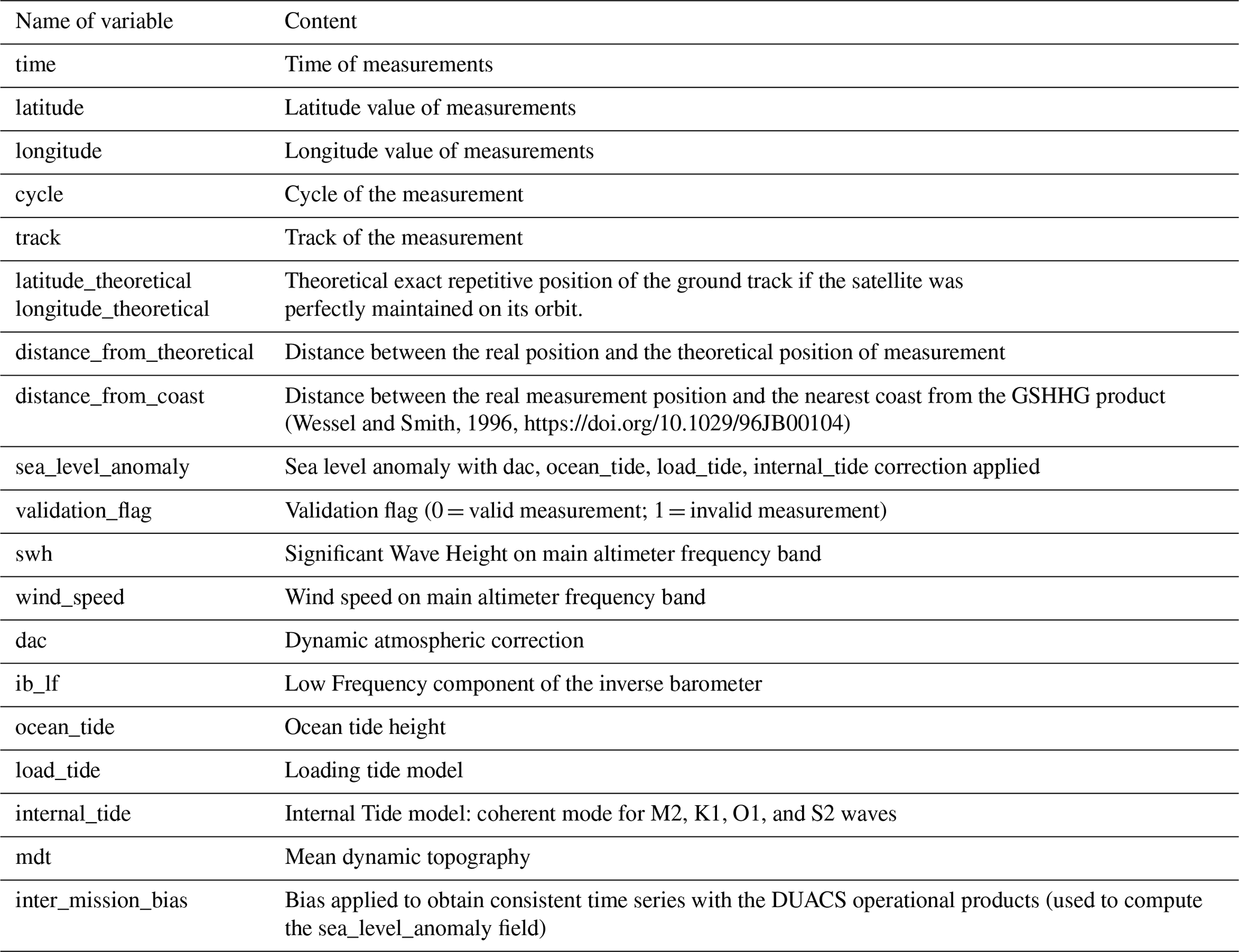 Typically, the per day files can be used for comparisons with other daily datasets, or for data assimilation in a numerical model (same format as CMEMS), while the per track files are more suited for local time series analyses and along track statistics. Both datasets contain exactly the same physical information.