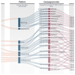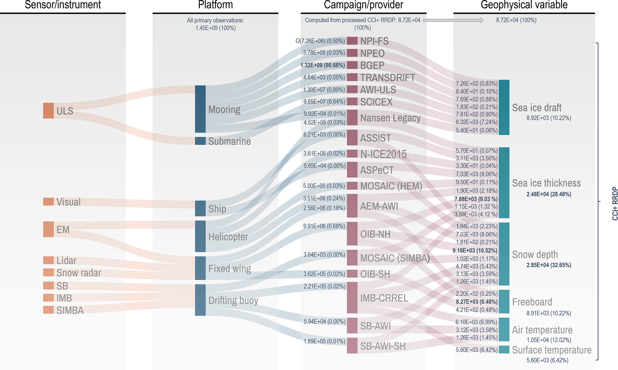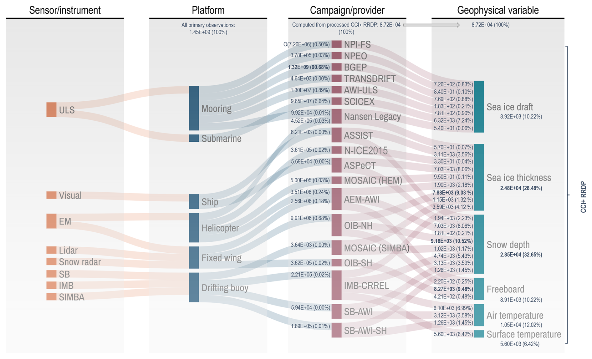 Figure 2Sankey diagram providing an overview of the data sources used in the CCI SIT RRDP and how they are acquired, by whom/when and what has been observed. The diagram is shown by four categories; sensor or measurement type, platform, campaigns (Table 2), derived geophysical variable, and their dependencies. We note that the data volume included in the CCI SIT RRDP is represented here by numbers (in scientific notation) and percentages, and it is dependent on the processing level. Platform data volume denotes raw data, while campaign/geophysical variables refer to processed data. Note that the highest contributing data sources (at different processing levels) are highlighted in bold, defined as the three highest contributing (in %) unless there is a large gap to the lesser contributors. In particular, the platform/mooring contributes more than 80 % of the data, which primarily reflects the large time series, high sampling frequency, and temporal coverage of the buoys. In contrast, campaign (OIB-NH, ASPeCt, or SCICEX) primarily reflect spatial coverage, since these numbers refer to the processed CCI SIT RRDP. In total, SIT and SD account for approximately 60 % of the CCI SIT RRDP. The notation O(number) denotes an approximation.