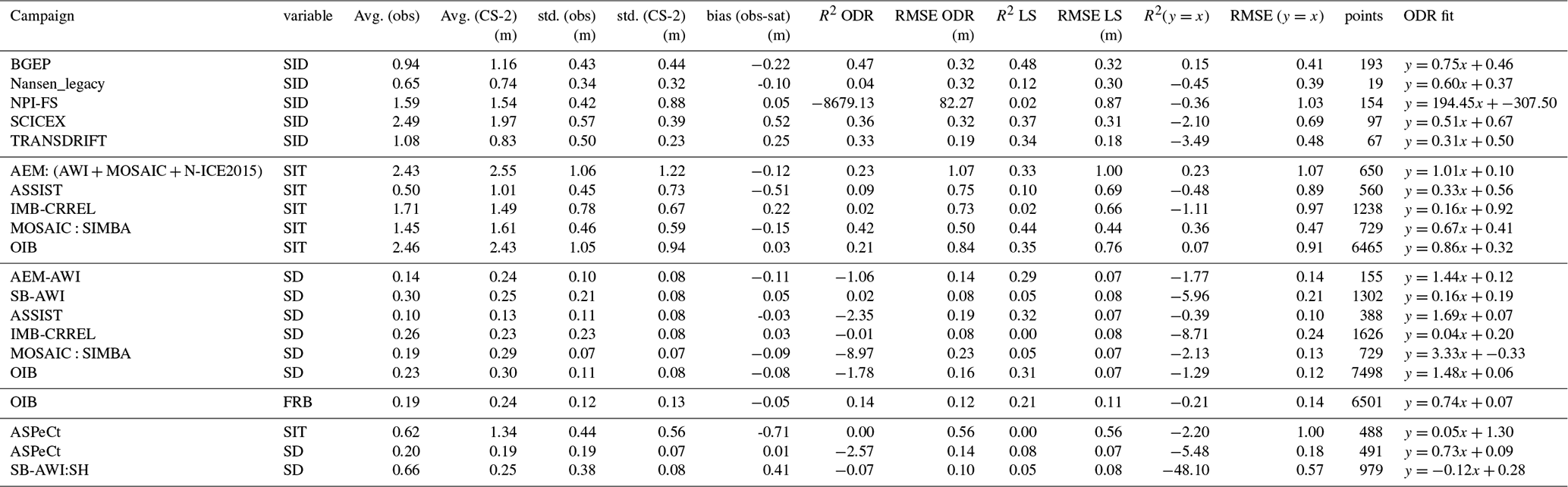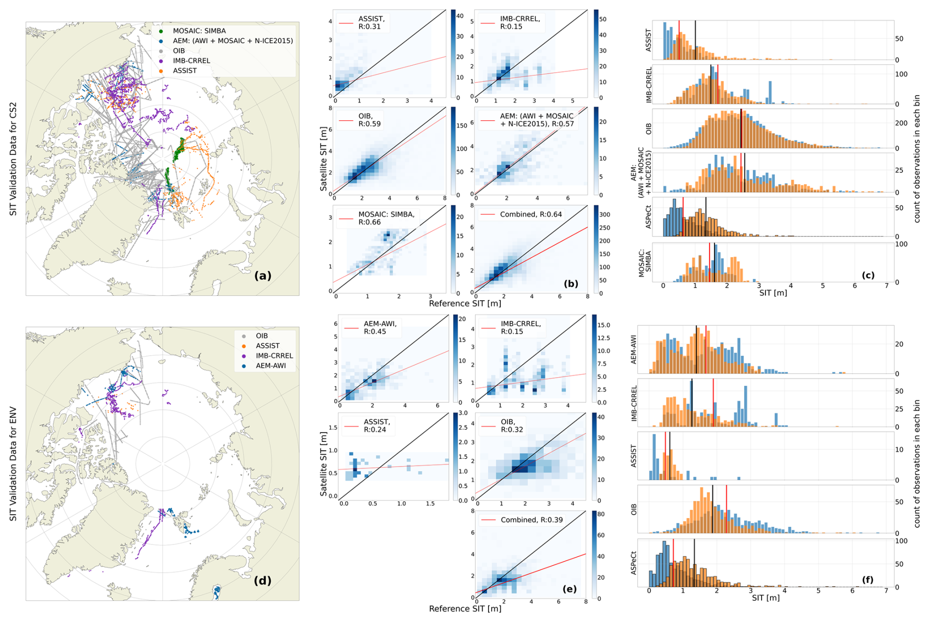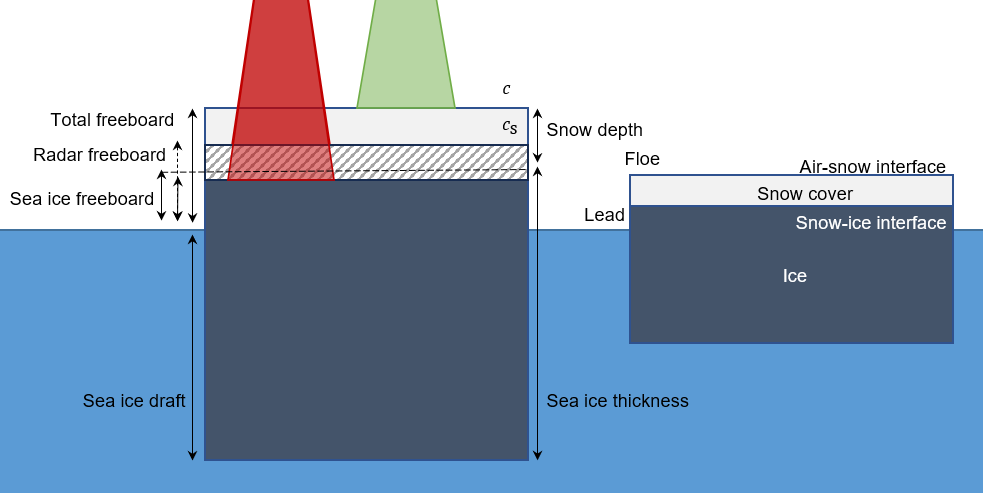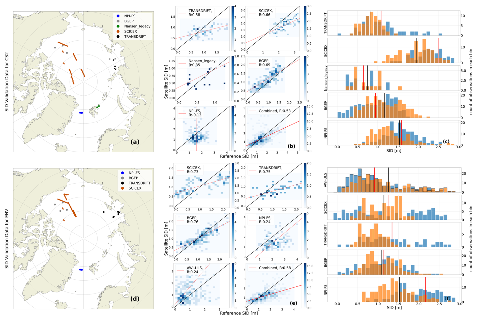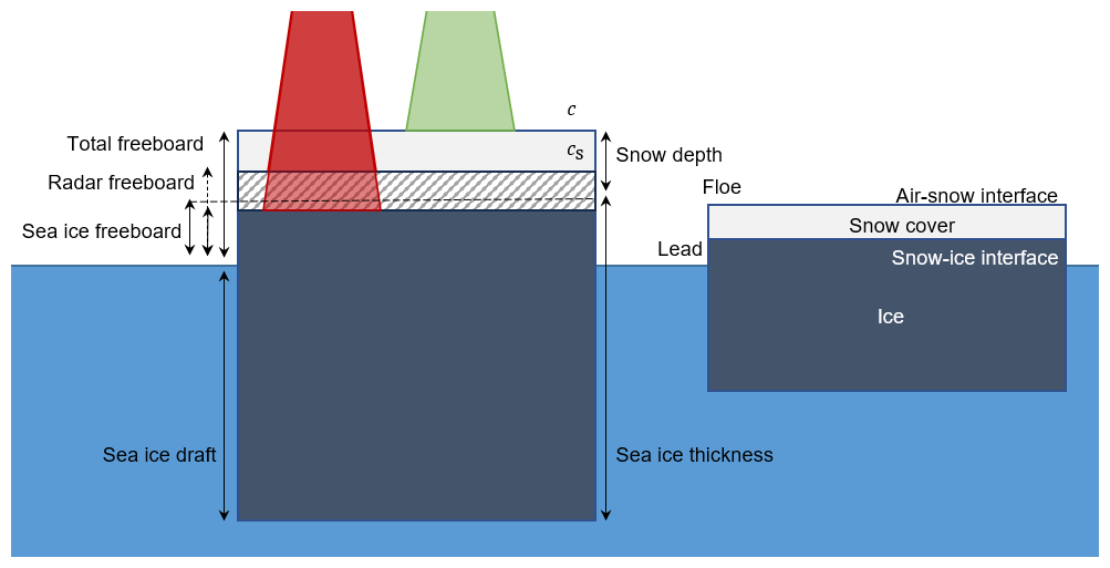 Comprehensive validation of satellite altimetry–derived sea ice thickness (SIT) Climate Data Records (CDRs) requires coincident observations of sea ice freeboard, thickness, snow depth, and densities of snow, ice and water (Fig. 1), following the assumption that sea ice is in hydrostatic equilibrium. Ideally, such measurements should match the spatial and temporal scales of the satellite data and cover the entire polar satellite altimetry era, beginning with the launch of the European Space Agency (ESA) ERS-1 mission in 1991 and its subsequent collection of scientific altimetry data over sea ice as of 1993. However, such observations are sparse and unevenly distributed across the Arctic and, even more so, in the Antarctic due to logistical constraints and high operational costs. In addition, most existing measurements provide only a subset of the required variables. Examples of these include: snow depth and total freeboard from coincident airborne snow radar and laser, draft from upward-looking sonar moorings, or snow depth and SIT from drifting buoys. Measurements of the densities of snow, sea ice, and water are even more limited than the above-mentioned parameters and are therefore not examined in this study.