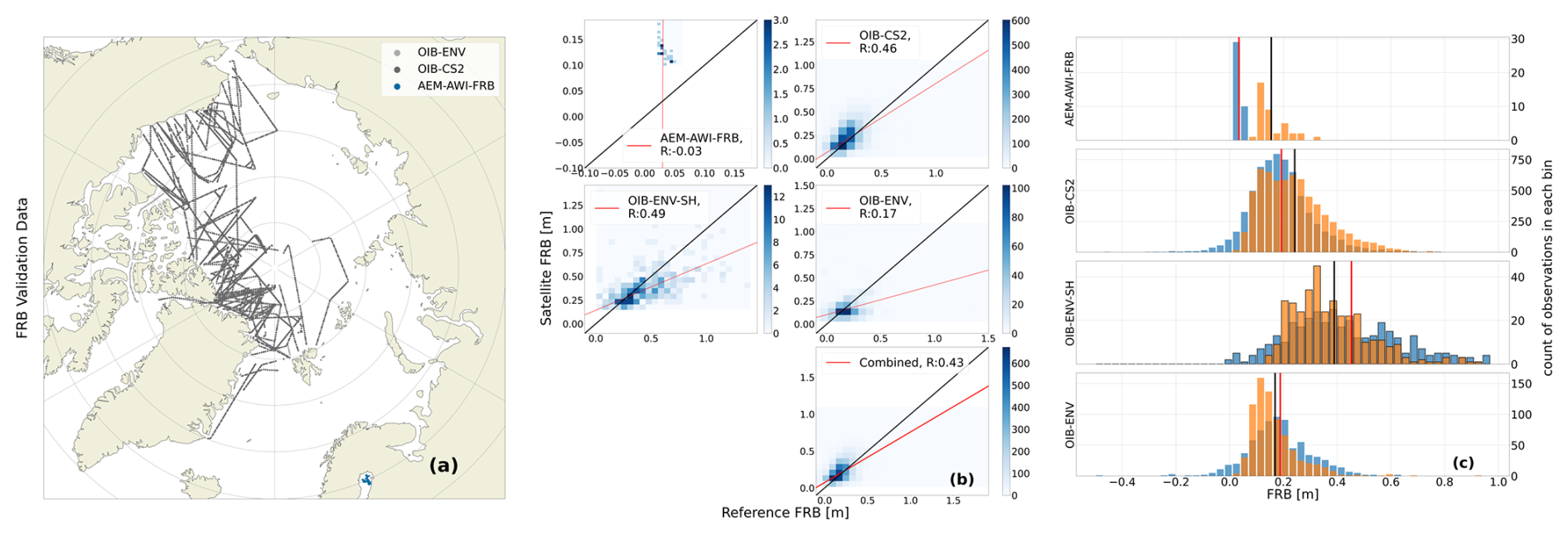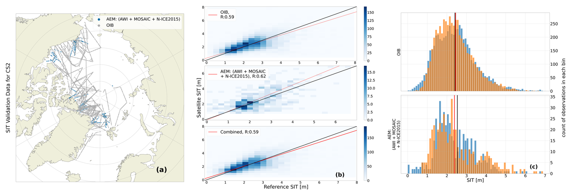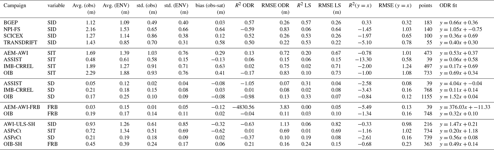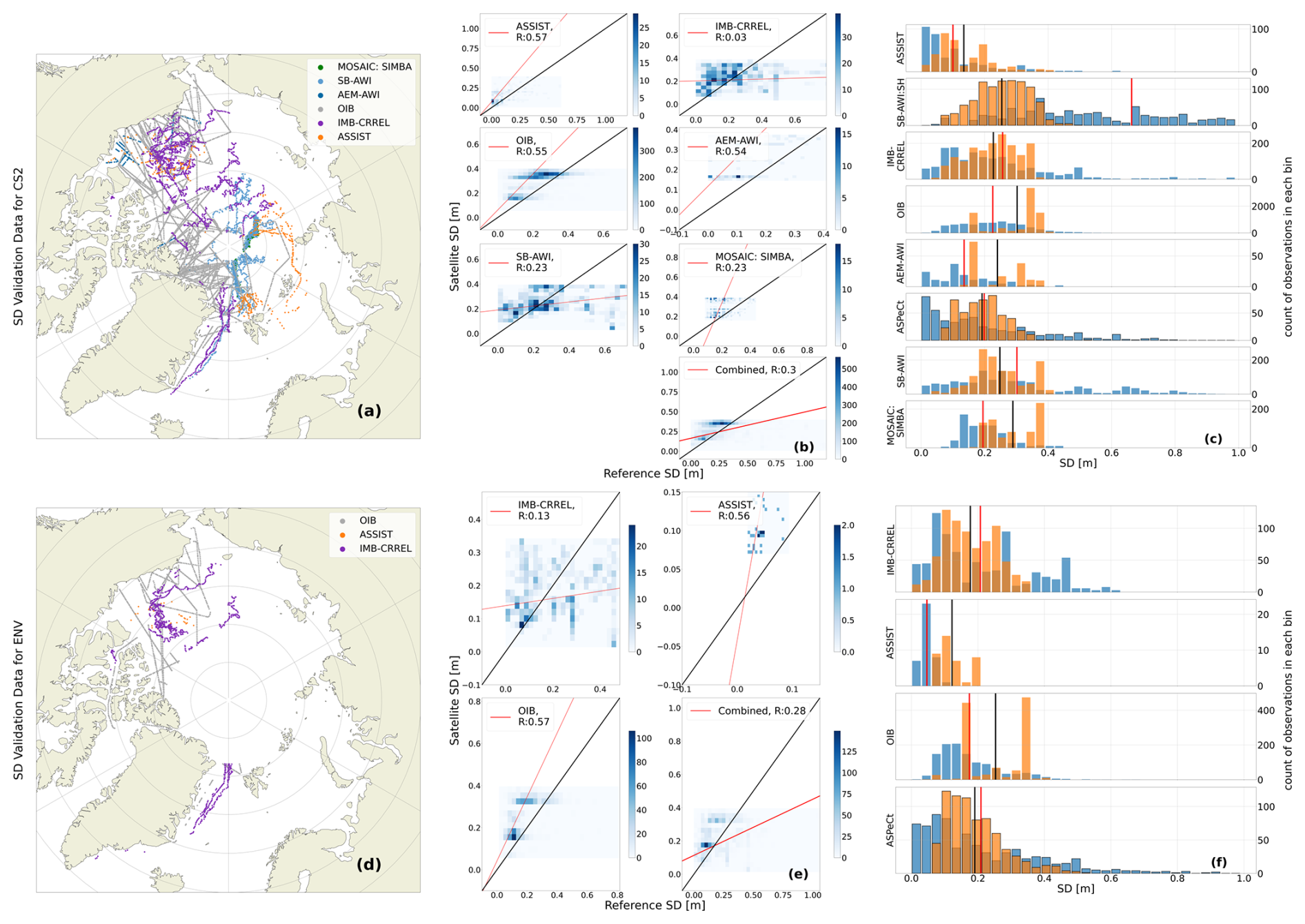Comprehensive validation of satellite altimetry–derived sea ice thickness (SIT) Climate Data Records (CDRs) requires coincident observations of sea ice freeboard, thickness, snow depth, and densities of snow, ice and water (Fig. 1), following the assumption that sea ice is in hydrostatic equilibrium. Ideally, such measurements should match the spatial and temporal scales of the satellite data and cover the entire polar satellite altimetry era, beginning with the launch of the European Space Agency (ESA) ERS-1 mission in 1991 and its subsequent collection of scientific altimetry data over sea ice as of 1993. However, such observations are sparse and unevenly distributed across the Arctic and, even more so, in the Antarctic due to logistical constraints and high operational costs. In addition, most existing measurements provide only a subset of the required variables. Examples of these include: snow depth and total freeboard from coincident airborne snow radar and laser, draft from upward-looking sonar moorings, or snow depth and SIT from drifting buoys. Measurements of the densities of snow, sea ice, and water are even more limited than the above-mentioned parameters and are therefore not examined in this study.