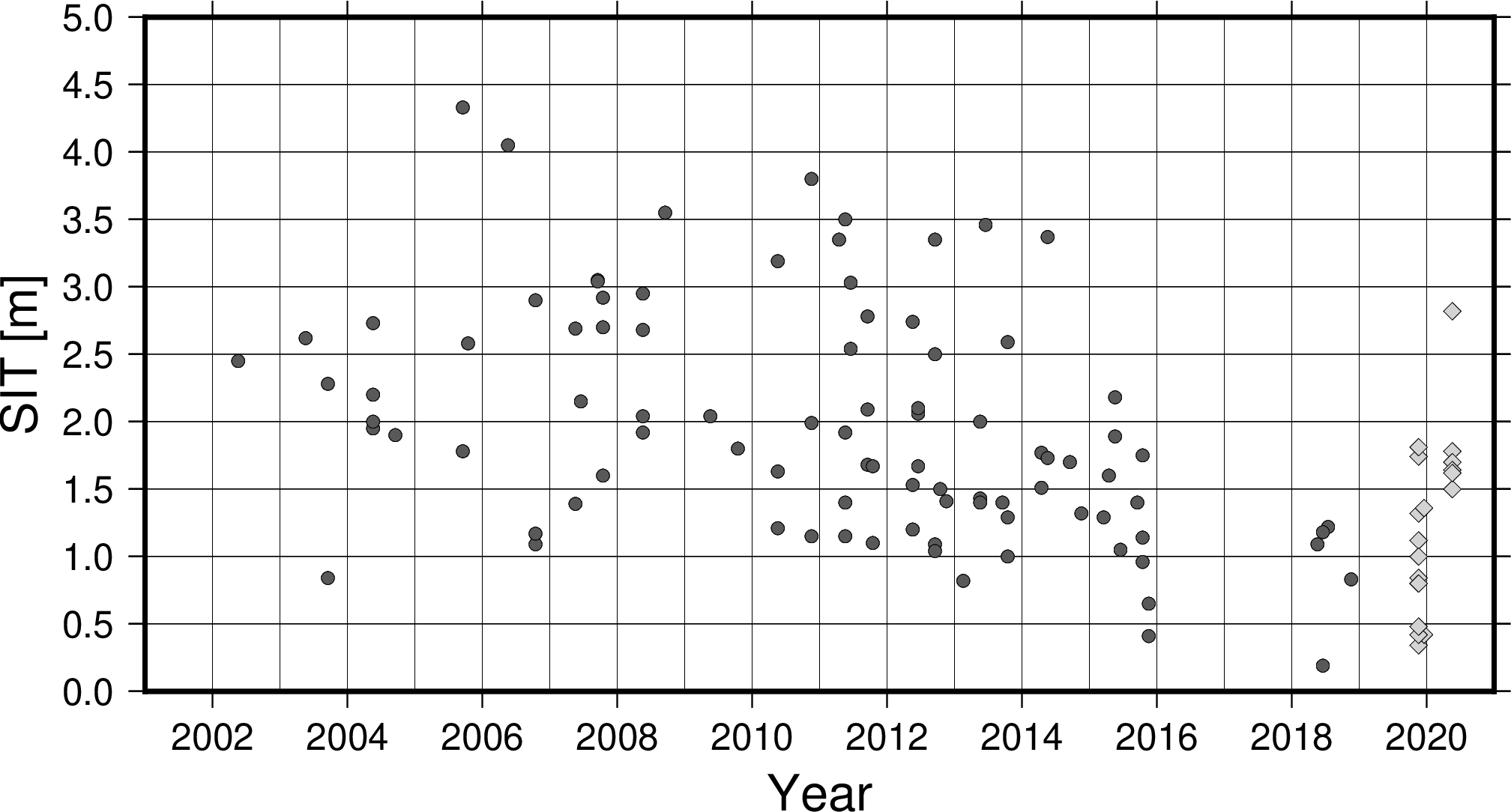 The IceWatch manual provides guidelines for observing SIT and SD from ships. The standard procedure requires making observations every hour while the ship is in motion. The ice is observed, depending on actual visibility conditions, up to 1 km/1 nm from the ship during a 10 min observation period, which is usually performed on the bridge of the ship. Recent instructions (https://aspectsouth.org/wp-content/uploads/2024/06/sea-ice-cards_LOGODOI.pdf, last access: 23 May 2025) reiterate that observations should be made every hour and recorded on the hour. Observers are required to document the sea ice types/classes and estimate their area coverage within a 1 km/1 nm radius of the ship, estimated from the radar display on the bridge of the ship. In addition SIT estimates are made by visually assessing overturned sea ice viewed from the bridge referenced to a 55 cm diameter buoy on the side of the ship, or a ruler/stick with 0.2 or 0.5 m graduation sticking out perpendicular to the side of the ship. Rafted ice is included in the thickness estimate, whereas ridged ice shall be excluded. The same measurement methodology is applied for SD, which is differentiated from ice by color.