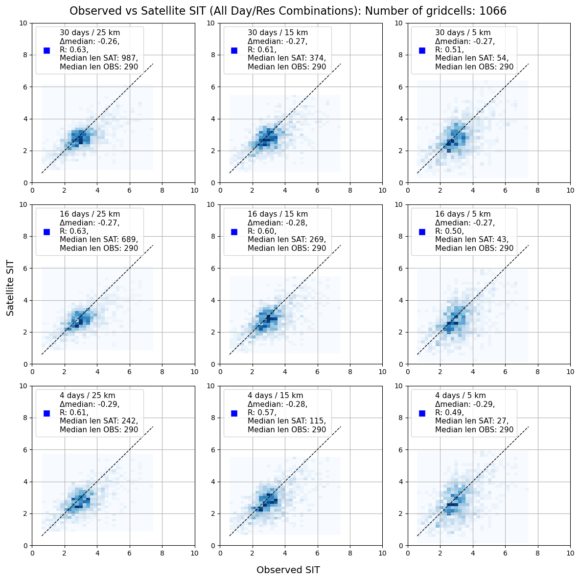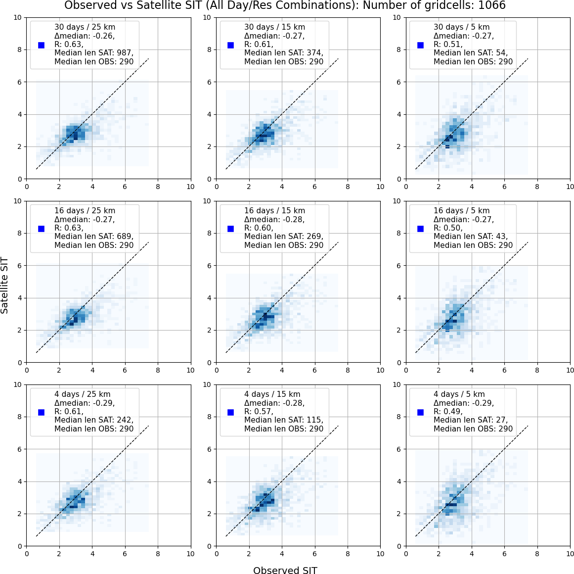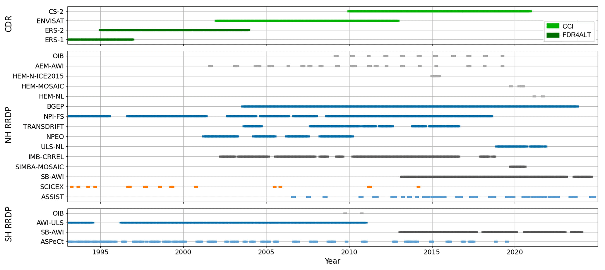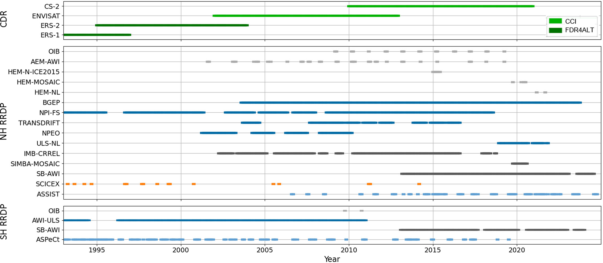 Validation of radar altimetry SIT products is rarely performed directly on along-track data. Instead, community practice, demonstrated in numerous studies (e.g., Laxon et al.2013; Tilling et al.2018; Carret et al.2025; Bocquet et al.2024; Landy et al.2022; Guerreiro et al.2017; Kwok and Kacimi2018; Kwok and Markus2018; Sallila et al.2019; Fons et al.2023), is to compare monthly altimetry-derived variables (e.g. SIT or snow depth) with monthly averages of reference measurements gridded to the same spatial resolution. This is primarily because most satellite SIT products have monthly temporal resolution, a necessity given the limited spatial coverage achieved by a single satellite altimeter in one day. Following this established practice, we grid the CCI SIT RRDP reference measurements to match the temporal (monthly) and spatial resolution of the CCI SIT CDRs: 25 km for the Northern Hemisphere (NH) and 50 km for the Southern Hemisphere (SH). We note that other SIT records may use finer grids, such as the Southern Ocean SIT product of Fons et al. (2023). This signifies that the processed values may not directly reflect the original measurement dates or locations, particularly in cases where the input data are limited by incomplete metadata (see Table 4 for an overview). Table 2 provides a comprehensive list of the original data sources, including their full temporal coverage, while Table 7 details the gridding methodology applied to each dataset. Figure 4 illustrates the specific date ranges associated with each dataset (temporally and spatially gridded) in the CCI SIT RRDP. Users requiring higher temporal or spatial resolution are encouraged to consult the original datasets directly, which are accessible via the links provided in Table 2.