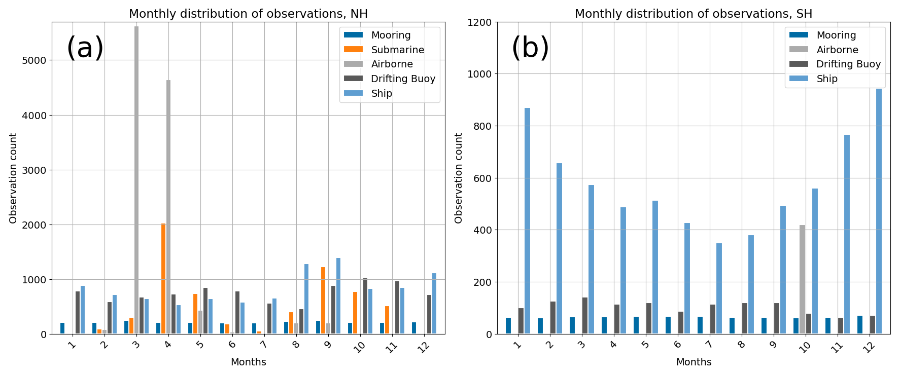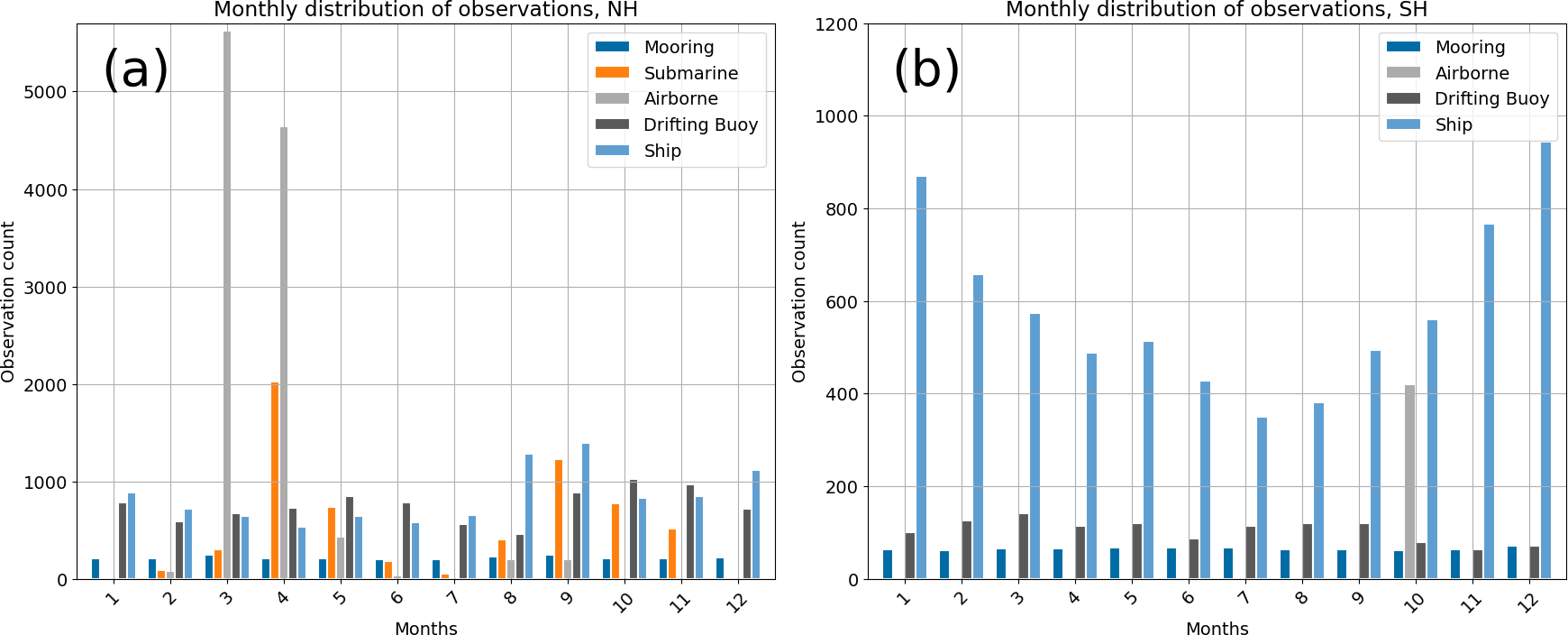 Figure 5Seasonal distribution of reference data in CCI SIT RRDP; (a) NH and (b) SH categorised based on sensor type.