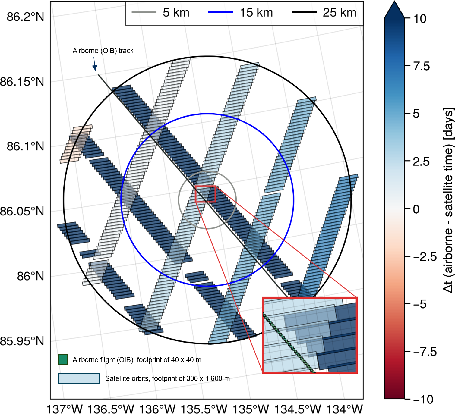 To showcase the temporal coverage of the reference measurements and their potential for validation of long-term SIT CDRs, we collocate the CCI SIT RRDP with the latest publicly available CCI SIT CDR version 3.0, which contains CryoSat-2 (2010–2020) and Envisat (2002–2012) (Hendricks et al.2024a, c) SIT time series. As this version does not include ERS-1 or ERS-2, we use radar freeboards from these historical missions provided by the ESA Fundamental Data Records for Altimetry (FDR4ALT) project (Bocquet et al.2023). This allows us to illustrate the coverage of the CCI SIT RRDP over the entire polar altimetry era.