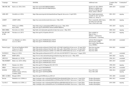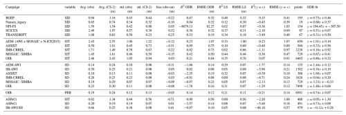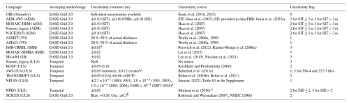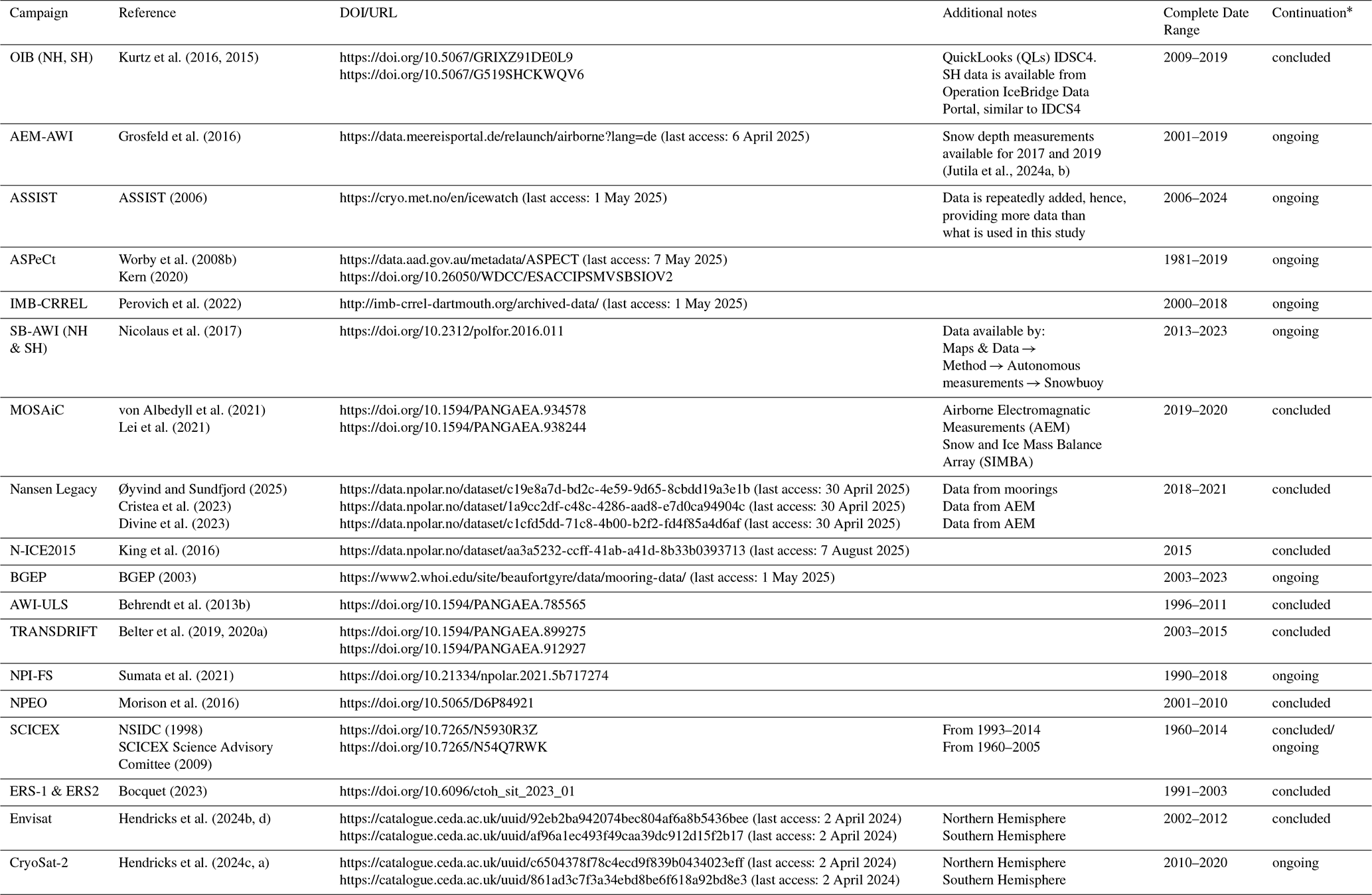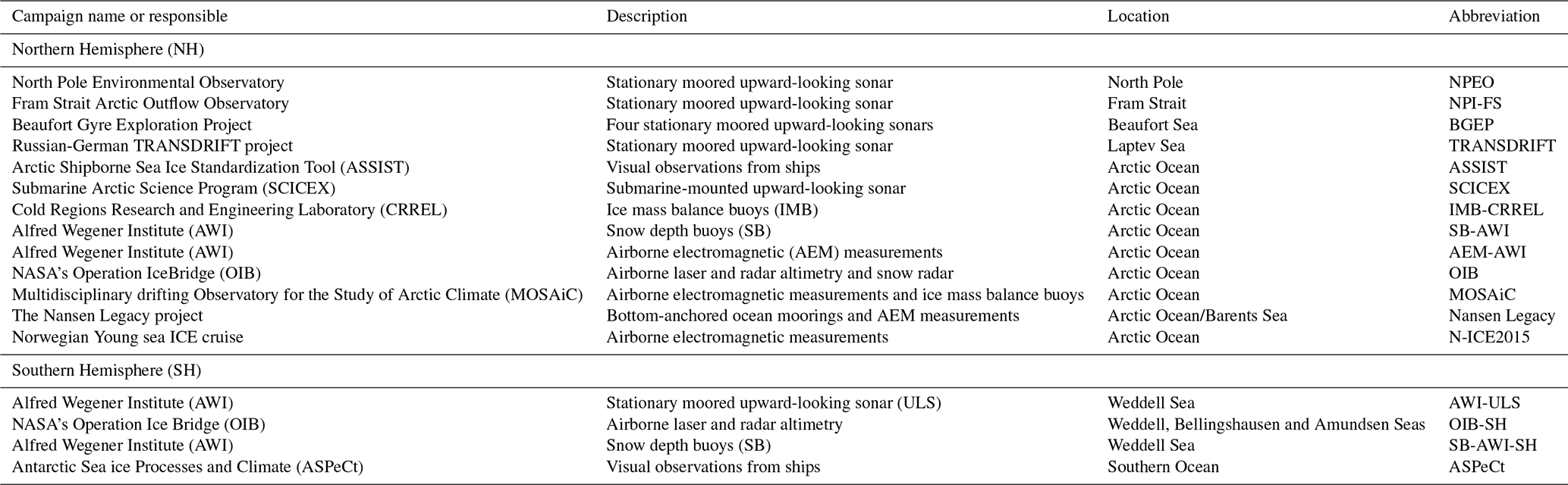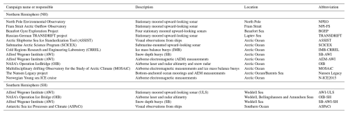 Table 1Overview of reference measurements and their sources included in the CCI SIT RRDP for both the Northern (NH) and Southern (SH) hemispheres.
