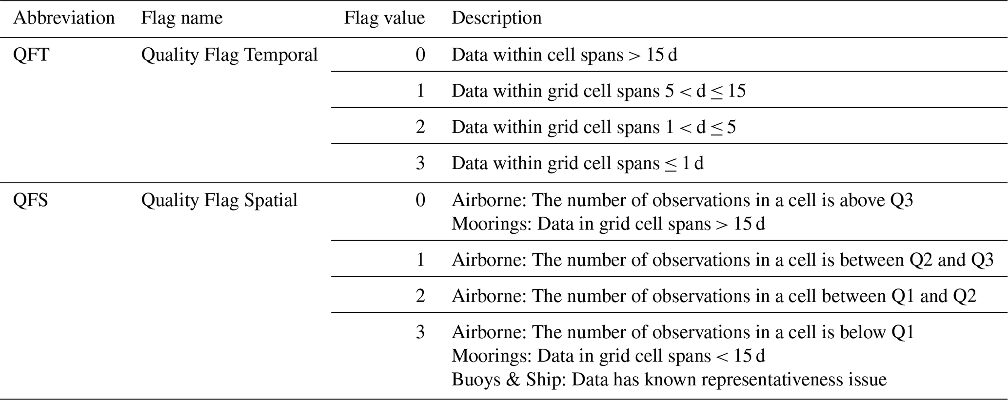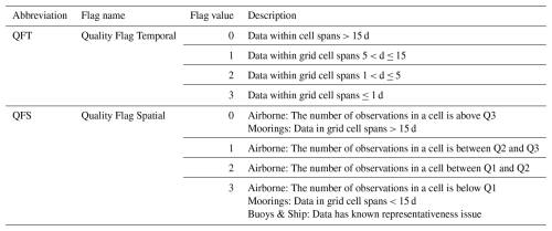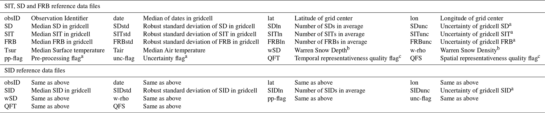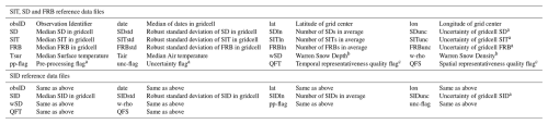 Reference measurements were averaged to the Equal-Area Scalable Earth Grid in version 2 (EASE2) provided by the National Snow and Ice Data Center (NSIDC). For each gridcell, the median was used to compute the average value, accompanied by the corresponding robust standard deviation (see Eq. 5). The date assigned to each gridcell corresponds to the median date of all observations within that gridcell. The median and robust standard deviation were selected to reduce the influence of outliers and to better handle skewed distributions present in several datasets. This approach was preferred over the mean and ordinary standard deviation to obtain a typical representative value for each grid cell. Using the median date also indicates when the reference measurements are most densely distributed and enables matchup weighting based on temporal distance. EASE2 is based on a polar aspect spherical Lambert Azimuthal equal-area projection (Brodzik et al.2012) and the WGS-84 reference ellipsoid. The NH grid dimension is 5400 km × 5400 km with a spatial resolution of 25 km, resulting in a grid consisting of 432 × 432 grid cells, whereas the SH grid has a spatial resolution of 50 km, resulting in a grid consisting of 216 × 216 grid cells. The grid is centered on the geographic pole, which means that the pole is located at the intersection of the center cells. A temporal resolution of 30 d is used for both hemispheres. Data obtained from stationary moorings have only been temporally averaged, as these are fixed in space. The output data was subsequently sorted temporally and processed into a standardized text format, as shown in Table 3. Since most campaigns only record some of the information required by the standardized format, missing values were filed as NaNs.