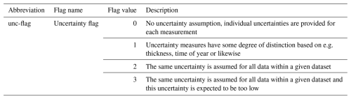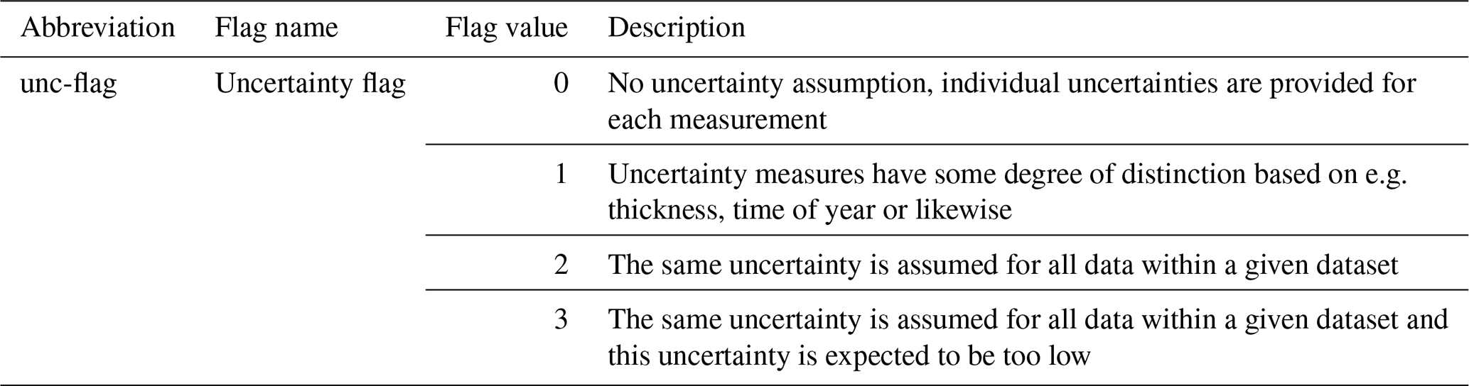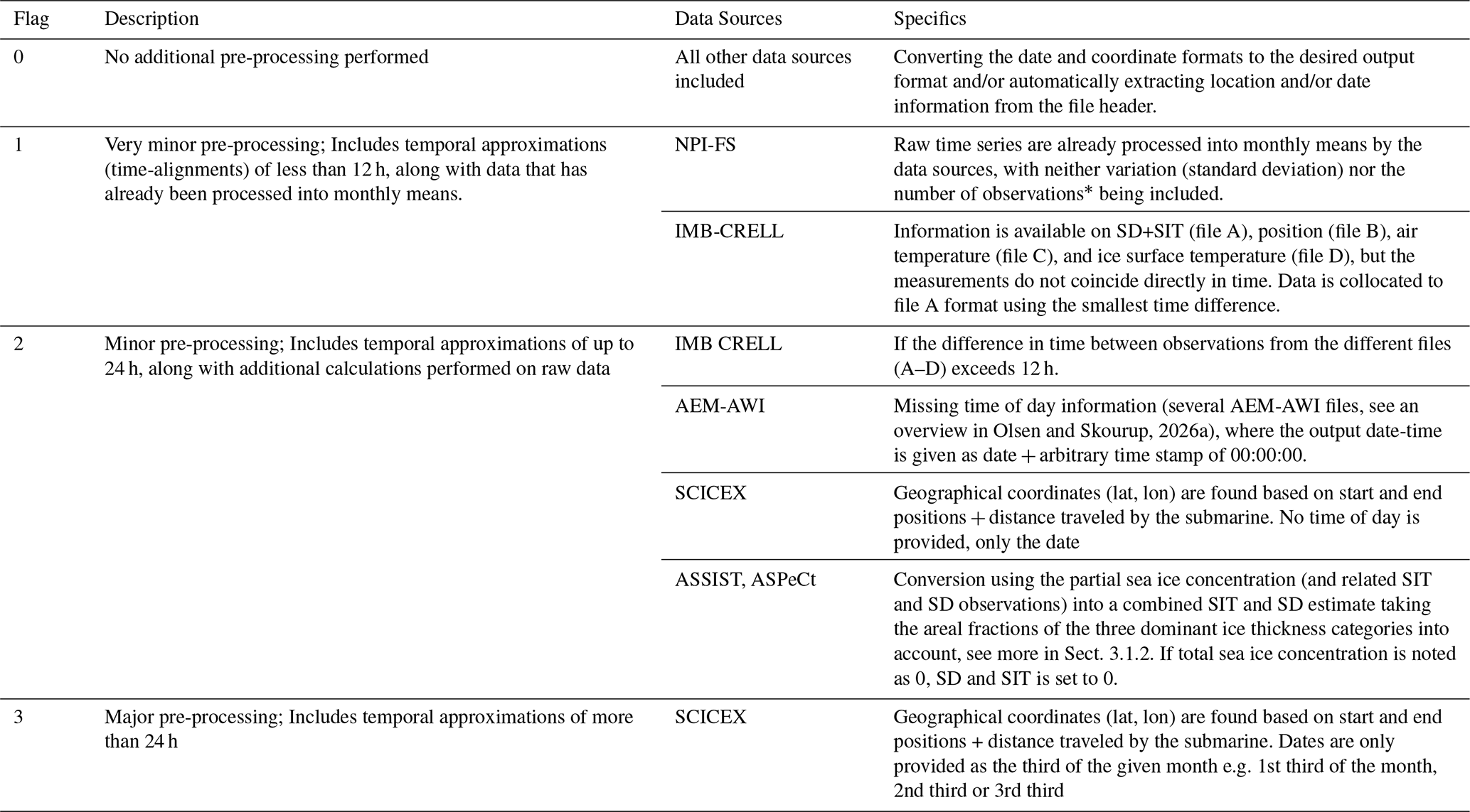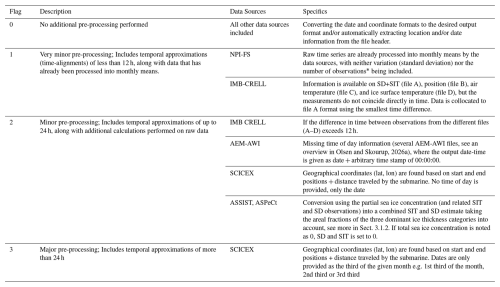 All reference measurements underwent pre-processing before being converted to common spatial and temporal scales for comparison with satellite-altimetry-derived composites. In most cases, the necessary pre-processing steps involved converting the date and coordinate formats to the desired output format and/or automatically extracting location and/or date information from the file header, which are all considered standard procedures. Additionally, observations were filtered to exclude data points that potentially represent outliers. Specifically, measurements were removed if SIT exceeded 10 m, SD exceeded 2 m, SID exceeded 8 m, FRB exceeded 2 m, or if any variable had values below 0 m. In addition, several subsets needed additional pre-processing steps due to, e.g., incomplete information of time and/or position. As a result, a pre-processing (pp) flag is included in the final data file, indicating whether the data required additional pre-processing steps, which could be associated with higher uncertainties. As the required level of additional pre-processing varies for the different types of reference measurements, an overview of the use of the pre-processing flag is presented in Table 4. It should be noted that, because the data are subsequently averaged into monthly means on a 25 km grid for the Northern Hemisphere (NH) and a 50 km grid for the Southern Hemisphere (SH), temporal uncertainties of up to 24 h are expected to have minimal impact. Discussions of temporal and spatial representativeness are presented in Sects. 4, 7.6 and 7.7. In the following subsections specific major processing steps are further detailed.