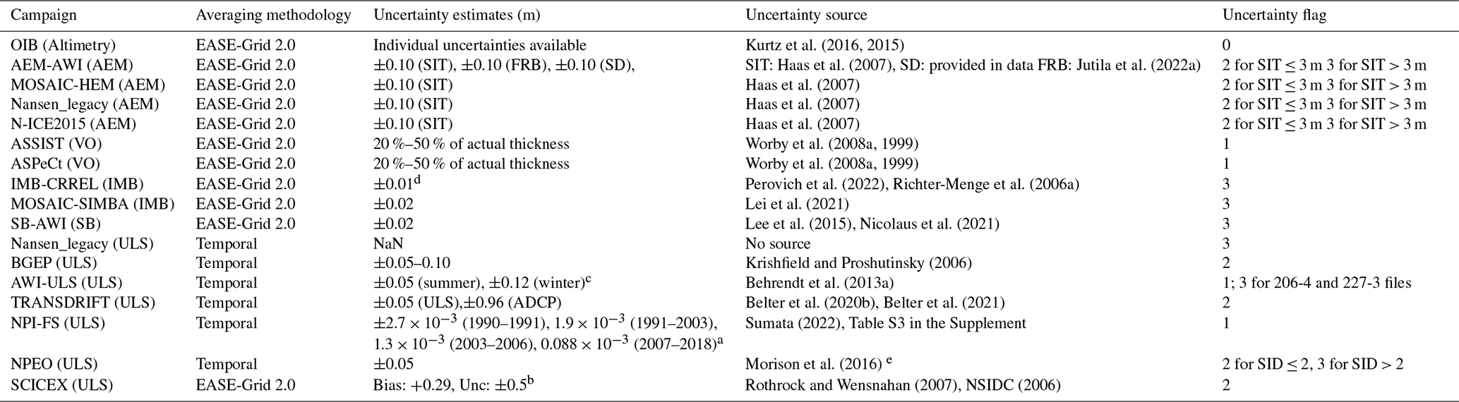 Since the reference measurements originate from various instruments and methods, their uncertainties vary significantly. As an example, some datasets lack detailed uncertainty information, and others provide only a single uncertainty estimate per dataset. As a result, estimating the uncertainty for each measurement in the CCI SIT RRDP is complex, but essential, and has been at the center of this work. Given the complexity of the error estimates, including sampling biases and the conversion of freeboard to thickness, we rely on a simplified approach rather than introducing advanced statistical methods that may not fully capture the underlying uncertainties. We refer the reader to the work of, e.g., Xu et al. (2020), for further insights into issues such as spatial representativeness and scaling properties related to airborne radar and laser observations.