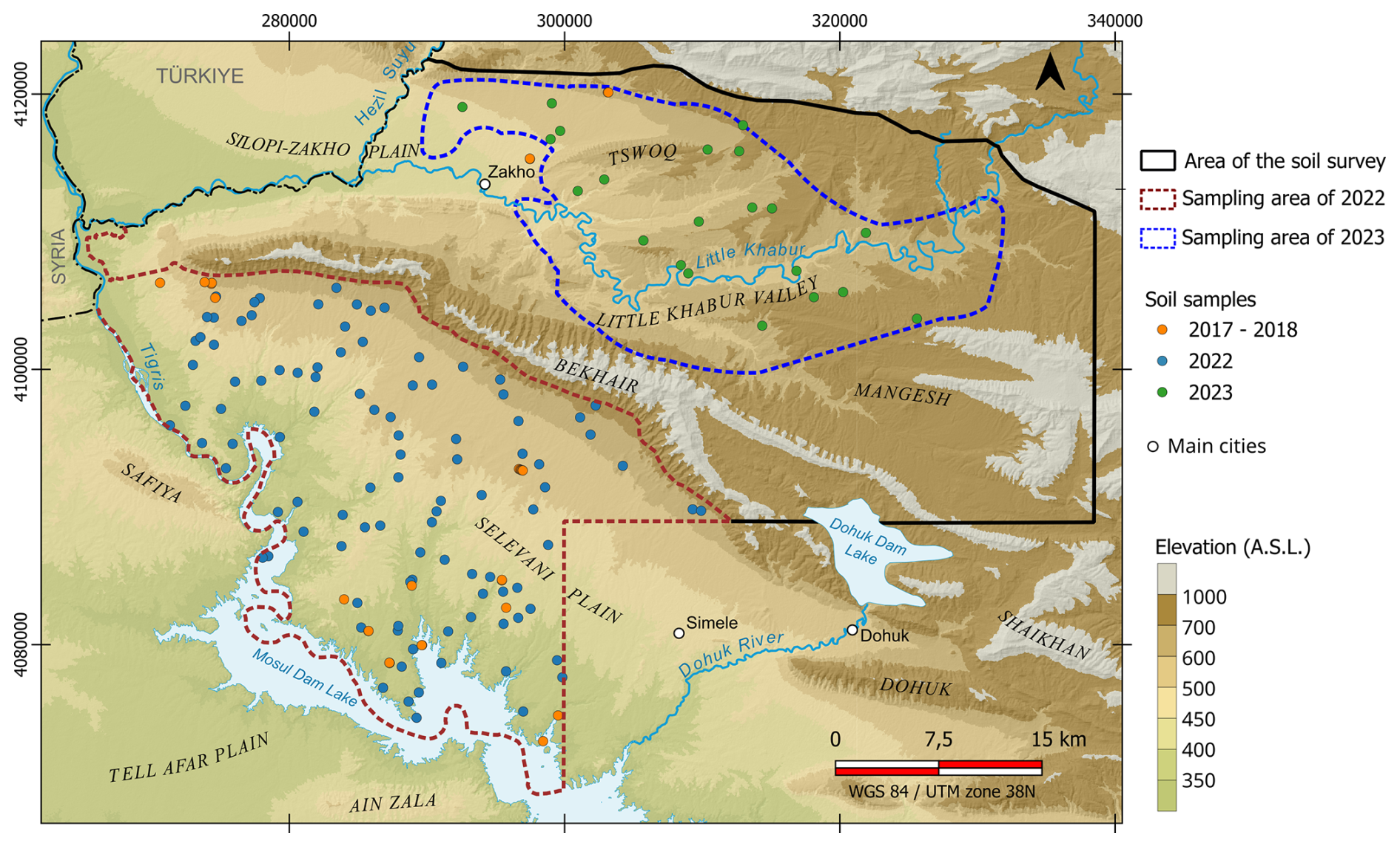 Previous classifications and soil descriptions in the region were mostly carried out at the national scale and do not reflect recent landscape changes (Forti et al.2022), nor do they align with contemporary standards (IUSS Working Group WRB2022). Moreover, no spatially explicit dataset currently exists for the most important chemical and physical soil attributes. While the previous mappings only used limited observations windows, with modern digital soil mapping (DSM), the spatial distribution of soils and their characteristics can now be described and modelled with increasing accuracy (Behrens and Scholten2006; Taghizadeh-Mehrjardi et al.2014). Therefore, we have developed a meso-scale (1:200 000; 30 m pixel) DSM of key properties in the Dohuk region, alongside an updated classification based on the WRB taxonomy (IUSS Working Group WRB2022). Soil sampling campaigns conducted between 2022 and 2023 enabled the creation of 10 soil property maps across five depth intervals and a soil depth model for the western part of Dohuk governorate (Fig. 1). All data products follow the FAIR principles (Findable, Accessible, Interoperable, Reusable; Wilkinson et al.2016) and were adapted to physical geography specificities (Bailo et al.2020). These outputs are relevant for application in agriculture, geography, and ecology, especially as climate change exacerbates desertification in Iraq (Eltaif and Gharaibeh2022; Eltaif et al.2024). The production of a spatial dataset from unexplored region, and the digital soil maps from recent field observations became an asset for depicting actual soil situations and exploring potential solutions.