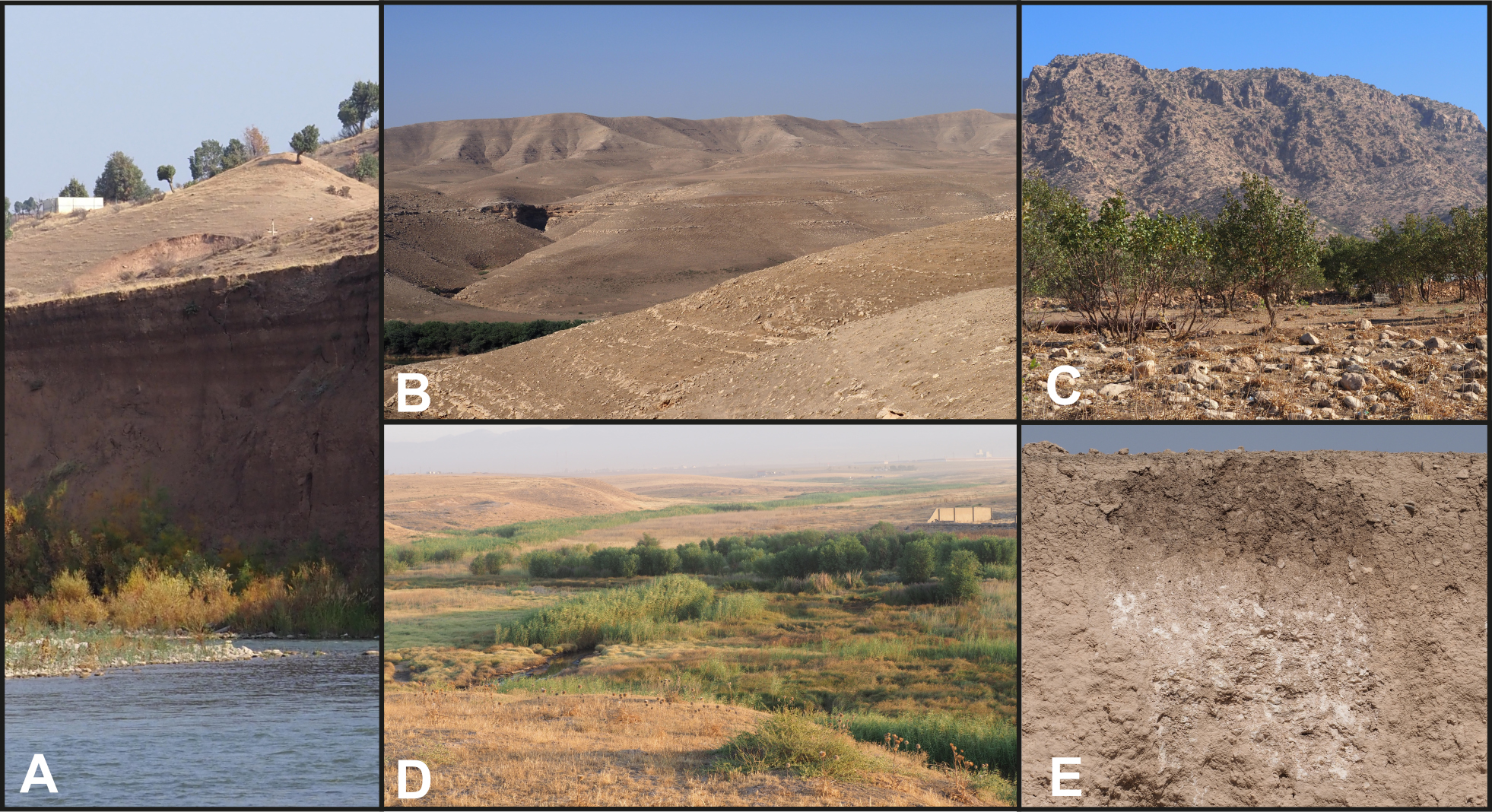 Figure 5Examples of landscapes (A) Terraces of the Little Khabur (10–11 m) featuring a succession of colluvial and flood deposits. 37°0514.46′′ N 42°5628.32′′. (B) Hill and badland landscape on marl formation. Wadıs shape this landscape mainly used for grazing. 36°5716.86′′ N 42°2838.53′′ E. (C) Foothills landscape at the base of the Bekhair. Stones are visible on the surface, and olive trees (Olivae europanis) are cultivated in these foothills. Lithosols, Cambisols or Calcisols dominate this landscape. 37°0350.73′′ N 42°3450.71′′ E. (D) Wadı landscape with heavily developed vegetation, shrubs and small trees. Fluvisols or Vertisols are usually associated with this environment. 36°5435.33′′ N 42°4429.64′′ E. (E) Calcisol developed on a conglomerate formation formation. The top 10–15 cm shows an A humic horizon, followed by 5–10 cm of a Bt horizon and a C calcitic horizon at the bottom. 37°0124.61′′ N 42°3037.11′′ E. Realised with Inkscape 1.4.