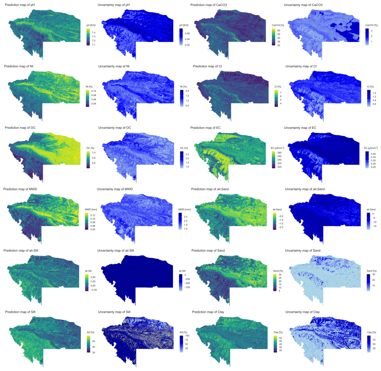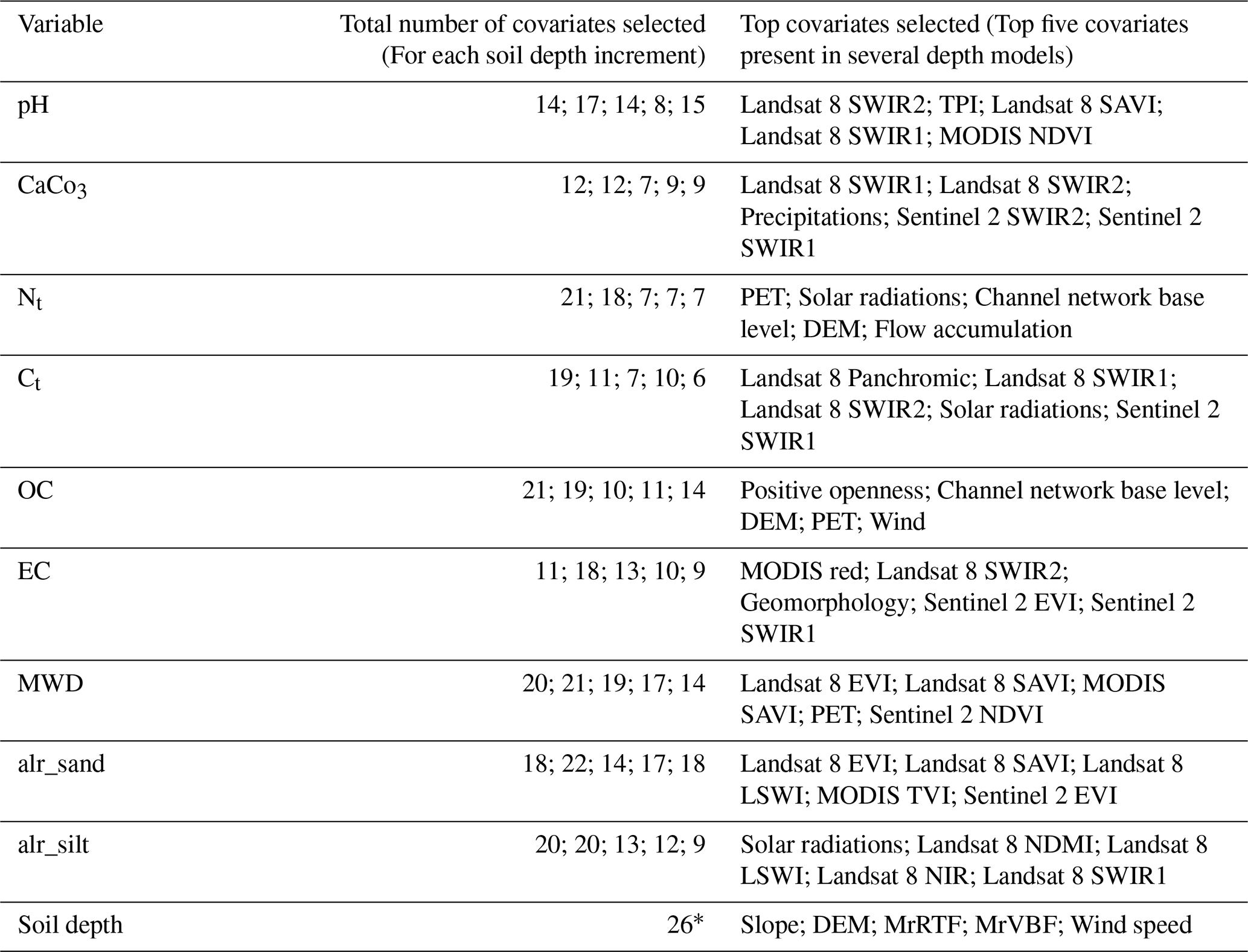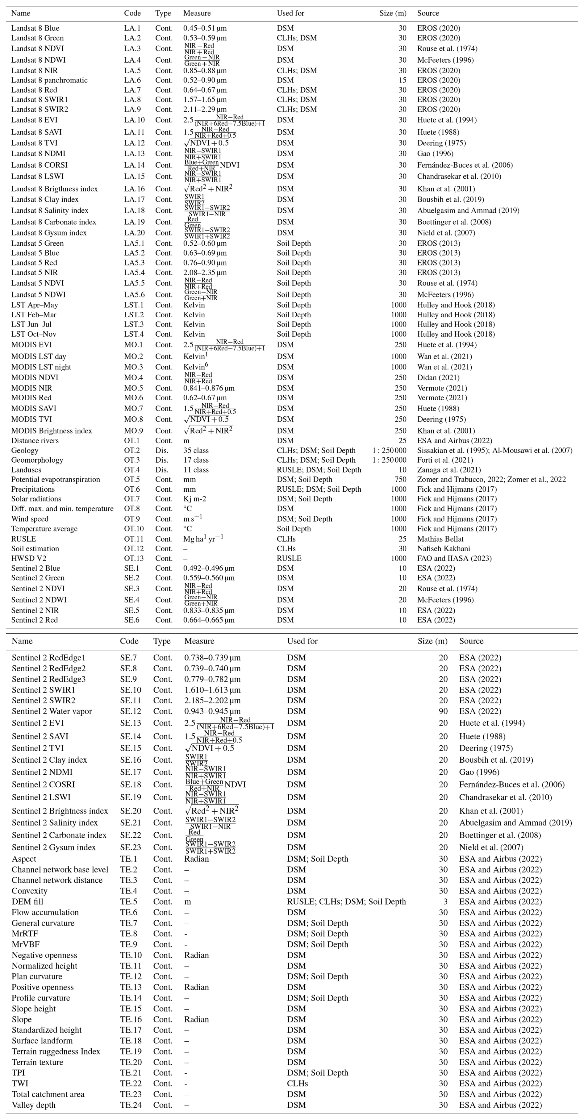 We based our soil property model on the soil formation factors of the scorpan equation (Eq. 1) developed by McBratney et al. (2003). We included 85 covariates (Tables 2 and ). The remote sensing variables were accessed through an API of Google Earth Engine (https://earthengine.google.com, last access: 15 January 2026) on Python, via the ee library (Google2025), and the different indices computed in R with the terra package (Hijmans et al.2025). The terrain variables were computed on SAGA GIS 9.3.1 (Conrad et al.2015) based on a filled and filtered DEM from GLO-30 (ESA and Airbus2022). All the computation was realised under R 4.4.0 environment (R Core Team2024). We included only the 2022 and 2023 samples to produce the DSM for two reasons. First, these campaigns followed a cLHS sampling strategy (cf. Sect. 2.2.1), whereas the 2017–2018 campaigns did not; including them would have reduced the consistency of the sampling design. Second, the 2017–2018 samples lacked depth information and were primarily limited to topsoil. To ensure data comparability, these earlier samples were therefore excluded, resulting in a dataset of 531 samples from 122 sites (Table 1). These samples were included in the DSM as input with: 122 samples for the 0–10 cm depth, 111 for the 10–30 cm increment, 108 for the 30–50 cm depth, 98 for the 50–70 cm increment and 92 for the 70–100 cm depth. We divided the mapping of each variable for each soil depth increment, resulting in 45 models and 50 maps in total (the three texture variables only include two alr models). We performed a standardisation of the predicted textures values from the Cubist model, with TT.normalise.sum function (Moeys et al.2024) and an additive-log ratio transformation (Aitchison1986) with the alr function (Tsagris et al.2025). This transformation preserved the spatial information of the prediction with a repartition close to a normal distribution (Liu et al.2022). Digital soil mapping have adapted this additive-log ratio on the texture with success, alr_sand = ln(sand/clay) and alr_silt = ln(silt/clay) (Poggio et al.2021; Varón-Ramírez et al.2022). Once the models were performed, the additive-log ratio was reversed into the three texture with the alrInv function, before being evaluated.