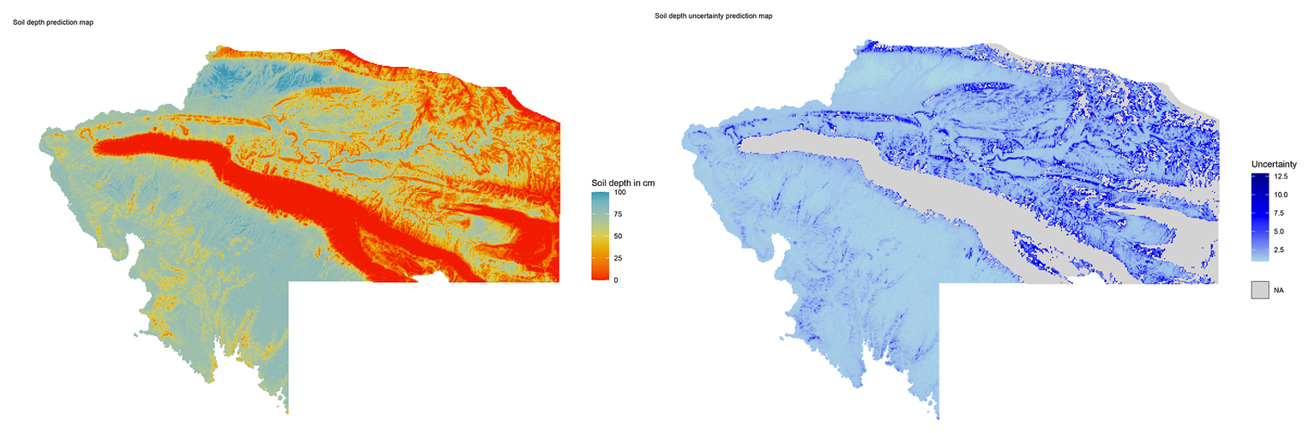 For each soil depth, we used a 10 k-fold cross-validation repeated 3 times to tune the model and choose the final settings. This resampling strategy allowed us to avoid potential overfitting due to the small size of our training data set (< 100). We trained the models on a specific random forest algorithm called “quantile regression forest model” (QRF), which has shown good performance for digital soil mapping (Varón-Ramírez et al.2022; Shi et al.2025). The model was implemented with the caret (Kuhn2019), and quantregForest (Meinshausen and Michel2020) packages. We tuned the mtry hyperparameters (1:n, by = 1; n beeing the number of covariates), which corresponds to the number of covariates randomly sampled as candidates at each split, and the minimum node size hyperparameter nodesize (5:31, by = 5, Shi et al.2025), which defines the minimum number of samples required to be at a leaf node. The number of trees was set as default at 500 (Liu et al.2022). Best hyperparameters were selected based on the lowest RMSE (Table E1), before beeing applied to produce a final model with the whole training dataset.