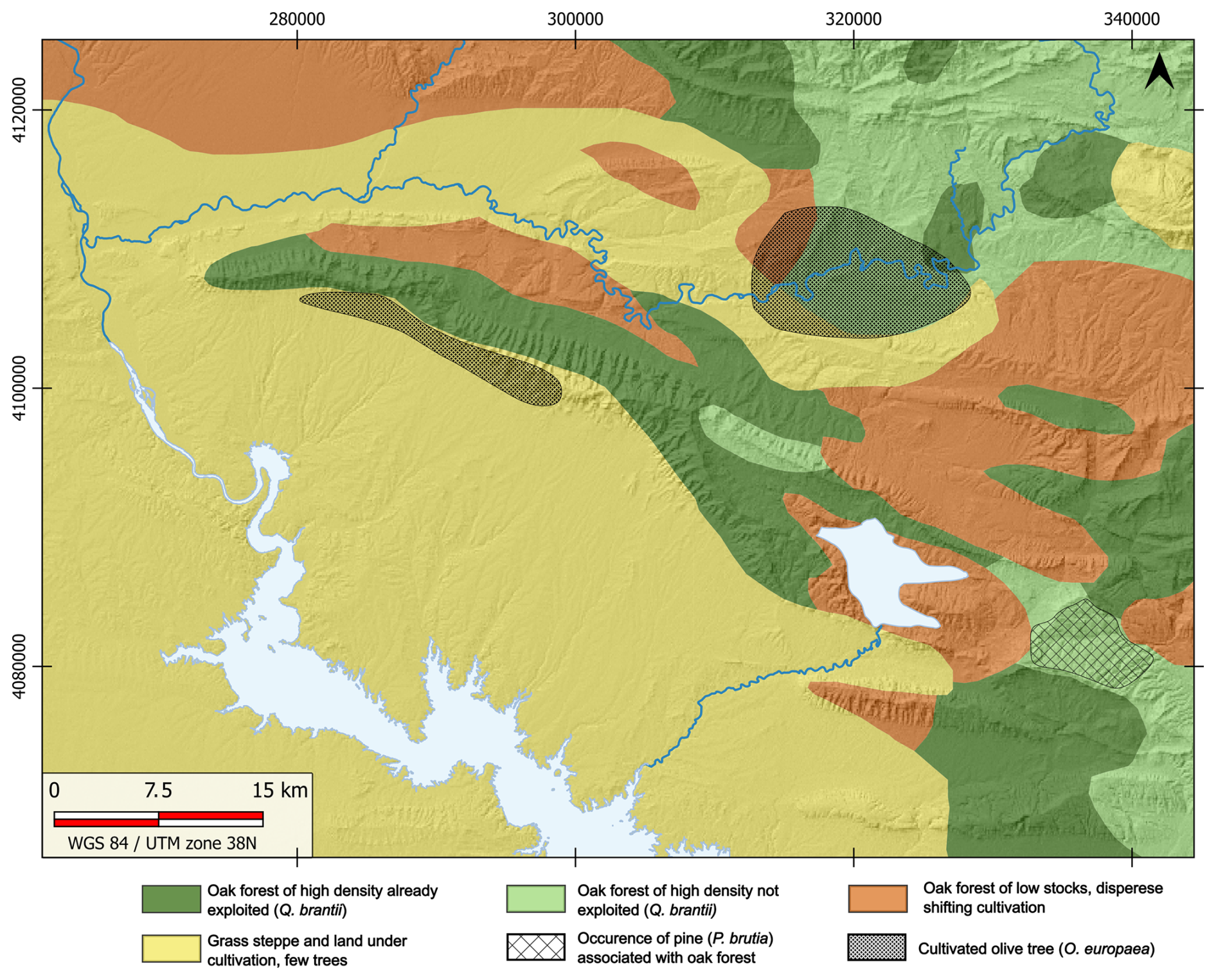 The central part of the study area falls within a Csa (Hot-summer Mediterranean) agro-climatic zone, according to the Köppen Geiger classification (Köppen1936; Beck et al.2018; Alwan et al.2019). Annual precipitation ranges from 200 to 500 mm, with an average yearly temperature exceeding 16 °C (Fick and Hijmans2017; Salman et al.2019; Najmaldin2023). Only the Little Khabur Valley, located north of the Bekhair anticline, experiences slightly cooler winters and receives higher rainfall, typically between 500 and 800 mm per year (Fick and Hijmans2017; Alwan et al.2019). South of the Bekhair anticline, the Selevani Plain belongs to the Mesopotamian steppe floral complex, which supports a limited number of xerophytic shrubs and herbs, primarily Artemisia herba-alba mesopotamica often associated with Aristida plumosa (Guest and Al-Rawi1966, pp. 78–80; Zohary1973, p. 183). In contrast, the northern region, encompassing the Zakho Plain and Little Khabur Valley, falls within the Kurdo-Zagrosian climate zone, characterised by a denser xerophilous deciduous steppe forest, driven by its higher elevation and more favourable climatic conditions (Fig. B1; Guest and Al-Rawi1966, p. 68). Dominant shrubs include Anagyris foetida or Pistacia khinjuk are associated with trees as Quercus brantti, or Quercus boissieri, which grows between 800 and 1700 m of altitude. Historical records mention the presence of pine forests (Zohary1973, pp. 183–190), though they are likely no longer extant. In both the foothills of the Mesopotamian Plain and the Kurdo-Zagrosian space, cultivated Olivae europanis can be sporadically observed.