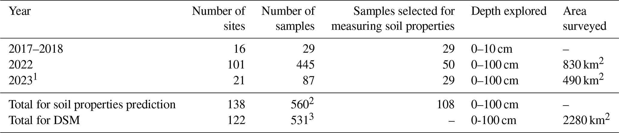 1 Original size of the non-reduced area is 1450 km2. 2 One sample did have FTIR spectra out of range, and therefore was not used. 3 Samples of the 2017–2018 campaigns were not used for the DSM due to the absence of several depth increments, and the highly clustered locations near archeological sites with modified soil caracteristics.