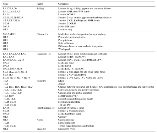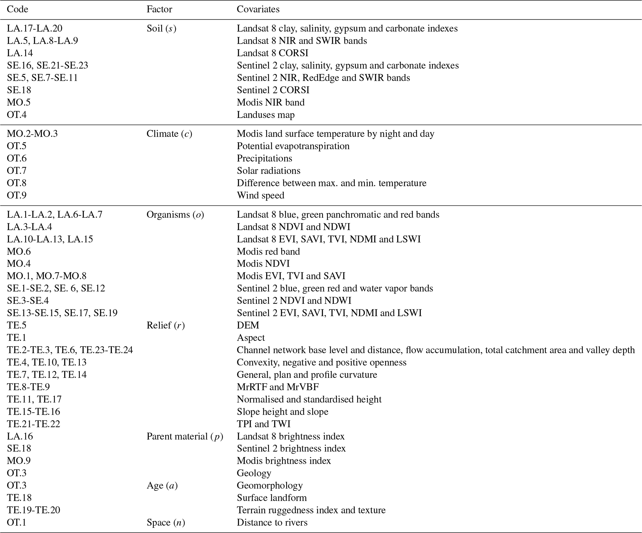 Table 2Environmental covariates by soil forming factor, for the digital soil mapping. These factors are based on scorpan model (Eq. 1; McBratney et al.2003; NIR = Near-infrared; NDVI = Normalised difference vegetation index; SWIR = Short wavelength infrared; EVI = Enhanced vegetation index; SAVI = Soil adjusted vegetation index; NDMI = Normalised difference moisture index; CORSI = Combined spectral response index; LST = Land surface temperature; TVI = Transformed vegetation index; LSWI = Land surface water index; DEM = Digital elevation model; MrRTF = Multiresolution index of the ridge top flatness; MrVBF = Multiresolution index of the valley bottom flatness; TPI = Topographic position index; TWI = Topographic wetness index).