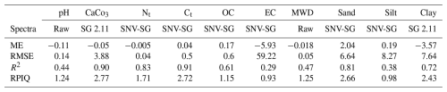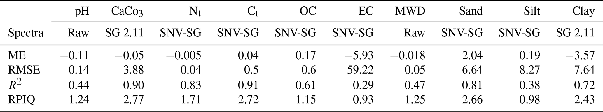The SNV-SG transformed spectra provided the best performance for six out of the ten soil properties, while SG-SNV and raw spectra were optimal for two properties each (Table 4). Model performance varied substantially depending on the soil property. For pH, predictions showed a slight underestimation bias (ME =0.11) and a moderate prediction error (RMSE = 0.14). The moderate R2 (0.44) indicates a limited ability to reproduce the observed variability. Predicted values displayed a narrower range than the observations and tended to concentrate around the mean (Fig. 7). In contrast, CaCO3, Nt, and Ct were predicted with higher accuracy. These properties showed minimal bias and relatively small prediction errors (RMSE = 3.88 %, 0.04 %, and 0.5 %). Their high R2 values (0.90, 0.83, and 0.91, respectively) indicate that a large proportion of the observed variability was captured by the models. For CaCO3 in particular, the low bias is notable given the wide range of observed values (Table 3), and the predicted distributions closely matched the observed ones (Fig. 7). The interpretation of Nt remains more cautious due to the strong skewness of its observed distribution. Organic carbon predictions showed a slight overestimation bias (ME = 0.17) and moderate error (RMSE = 0.6 %). Given the high skewness of the observed values, this performance can be considered acceptable, although the R2 (0.61) indicates that part of the variability remains unexplained. Regarding the electrical conductivity, the strong underestimation bias (ME =5.93 µS cm−1), large RMSE (59.22 µS cm−1), and low R2 (0.29) indicate weak predictive performance. This suggests that EC is not well captured by the spectral information. The high variability and skewness of the observed EC values likely contributed to this difficulty. Predicted EC values were strongly concentrated in the lower range compared to the observations, as reflected by their smaller standard deviation and distribution pattern (Fig. 7). For MWD, predictions showed a slight underestimation bias and moderate error (ME =0.018 mm, RMSE = 0.05 mm). However, the model failed to reproduce the upper range of observed values (Table 3). The predicted distribution showed reduced variability, with high MWD values systematically underrepresented. This indicates limited ability of the model to capture extreme aggregate stability conditions. Regarding soil texture, clay content was generally underestimated (ME =3.57 %), whereas sand and silt showed slight overestimation biases (ME = 2.04 %, 0.19 %). Prediction errors were similar for all three fractions, but a good explanatory power was obtained for sand and clay (R2= 0.81 and 0.72), whereas silt showed weaker performance (R2= 0.38). The silt model particularly failed to represent the lower and higher ends of the distribution, resulting in a concentration of predicted values near the mean (Fig. 7). Overall, predicted texture fractions exhibited lower variability than the laboratory measurements, especially for silt.