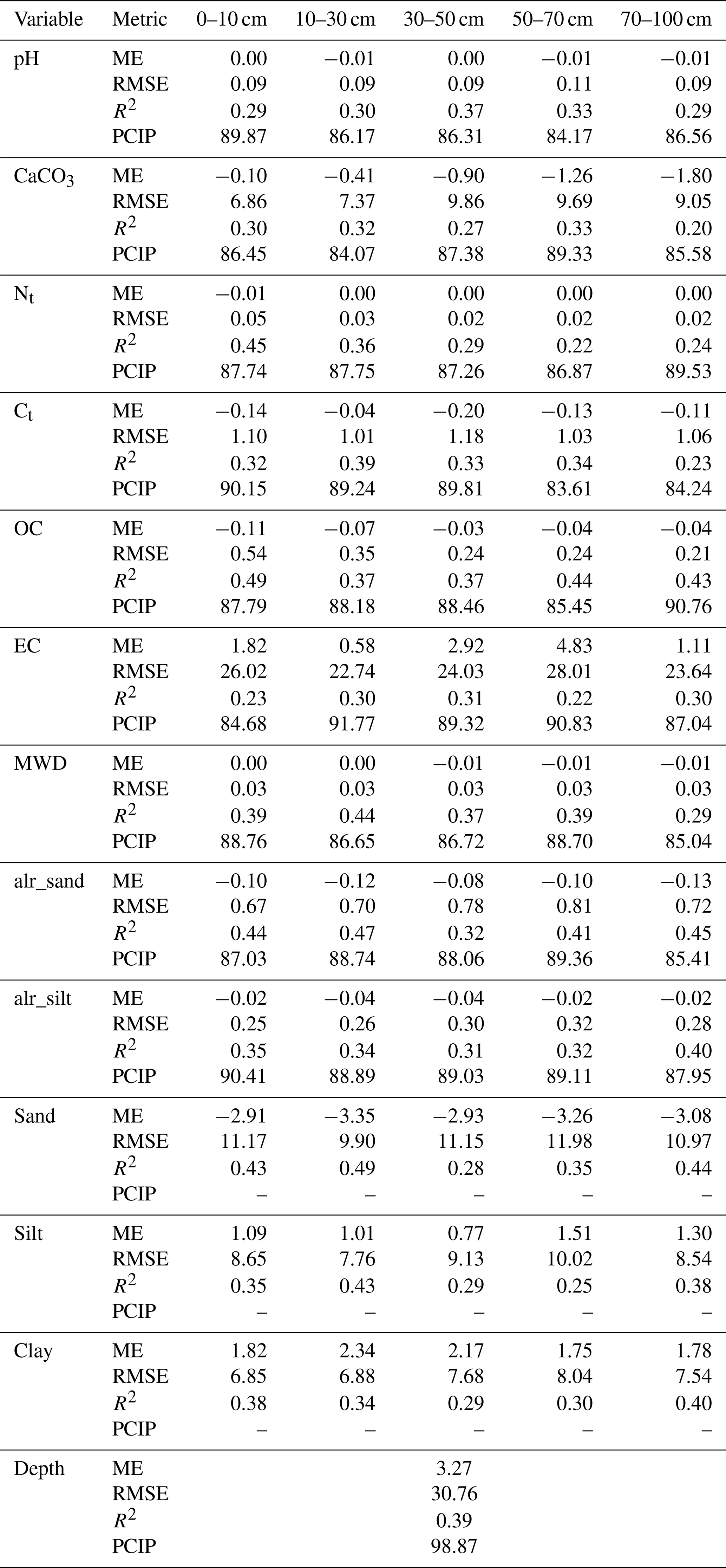 The models generally showed low bias (Table 6), including for EC, where the largest ME (4.83) occurred only in the 50–70 cm layer. Sand and clay were the only variables showing systematic bias, with sand tending to be underestimated and clay overestimated. In contrast to the Cubist predictions, silt performed better than the other texture fractions in terms of bias, although clay had slightly lower RMSE. Overall explanatory power was relatively low, with R2 values mostly below 0.5. Some depth-dependent variability in accuracy was observed. For instance, CaCO3 and clay prediction errors increased with depth, whereas OC showed the opposite pattern, with lower RMSE at greater depths (Table 6). Prediction interval coverage was generally close to the nominal 90 % level, with PICP values mostly ranging between 85 %–95 %, indicating slight overestimation of uncertainty. A few exceptions were observed: pH at 50–70 cm, CaCO3 at 10–30 cm, and Ct at 50–70 cm. Overall, this suggests that the models were reasonably well calibrated. PICP was not reported for texture fractions. Because log-ratio transformations are nonlinear, nominal coverage may not be strictly preserved after back-transformation.