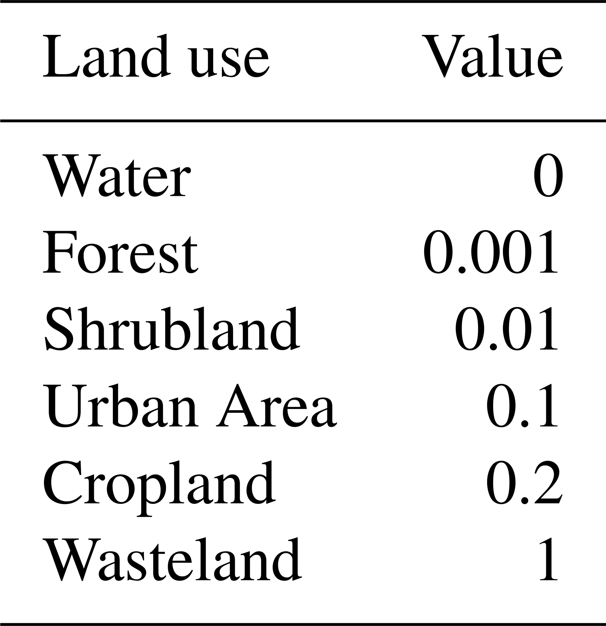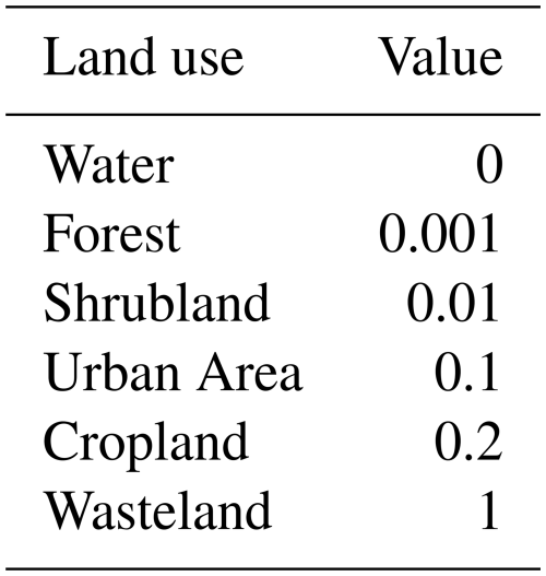 The potential soil properties layer was constructed using spectral indexes (clay minerals, ferrous minerals, rock outcrop, carbonate) derived from climatic and satellite datasets (Copernicus2019; EROS2020). Erosion risk was modelled using the Revised Universal Soil Loss Equation (RUSLE; Renard et al.1991), incorporating five key factor: soil erodibility (K), soil coverage (C), topographic effect (LS), rainfall-runoff (R) and erosion control practices (P; Cossart et al.2020; Thapa2020; Abdi et al.2023; Mehri et al.2024). In our RUSLE model (Table C1), we set K as the soil strength factor based on texture and organic carbon values (Kouli et al.2009), and C was set with values from Morgan (2005) and Swarnkar et al. (2018). Slope length and steepness factor LS were based on Desmet and Govers' method (Desmet and Govers1996), while the R factor from Morgan et al. (1984) was used. Finally, the conservation factor P, which could not be observed, has been set to 1 artificially, as suggested by Mehri et al. (2024).