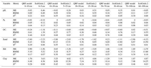 Feature selection using Boruta substantially reduced the number of covariates by 75 %–93 % (Table 5). Models for deeper soil layers selected fewer covariates than those for the upper layers. The most influential predictors were Landsat 8 SWIR bands and SAVI indices. Sentinel-2 SWIR bands, the EVI index, DEM-derived variables, potential evapotranspiration, wind speed, and solar radiation were also important. Overall, Landsat 8 products performed slightly better than Sentinel-2. These covariates mainly correspond to the s (soil), o (organisms), and r (relief) components of the scorpan framework.