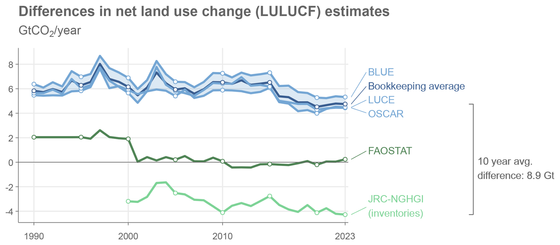 Figure 2Differences in net land use change (LULUCF) estimates. Data: bookkeeping models BLUE, OSCAR, H&N and their average from Friedlingstein et al. (2025b); FAOSTAT from FAO (2025b) and Tubiello et al. (2025); Inventories from JRC-NGHGI (Melo et al., 2025). Composite data based on inventories and FAO are also available in PRIMAP-Hist, but not shown here.