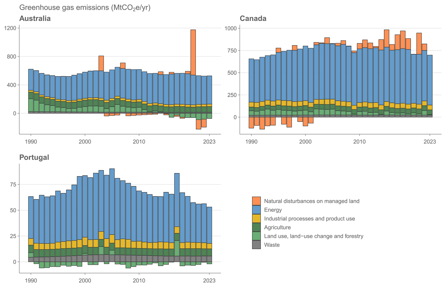 Figure 3Alternative approaches to accounting for wildfires in national GHG inventories. Australia and Canada report wildfires as the memo “natural disturbances on managed land” and exclude these emissions and subsequent removals from their totals. Note that Canada started to count natural disturbances before 1990 and therefore has excluded removals in the early 1990s that occurred on previously burnt areas. Other countries have so far not used the natural disturbances memo and instead report and account for wildfires on managed land in the LULUCF sector, even in years with major events – such as Portugal in 2017. Data: National GHG inventories compiled by Lamb (2025).