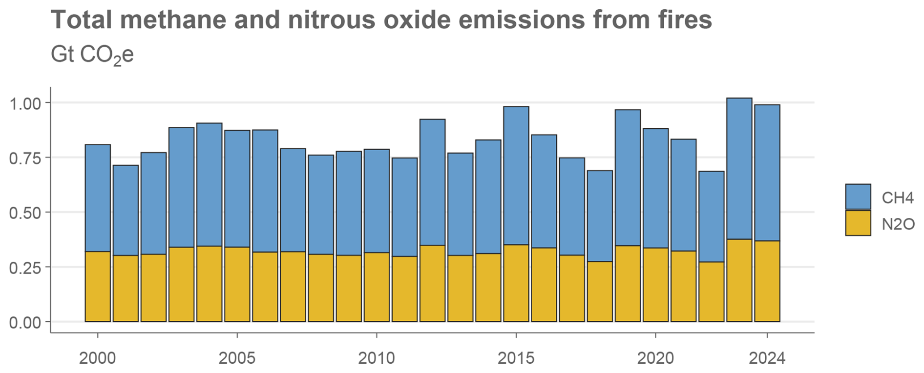 Figure 5Global methane and nitrous oxide emissions from fires. Data: GFEDv5.1 (van der Werf et al., 2025). CO2e emissions are calculated using GWP100 from AR6 WGI chap. 7 (Forster et al., 2021).