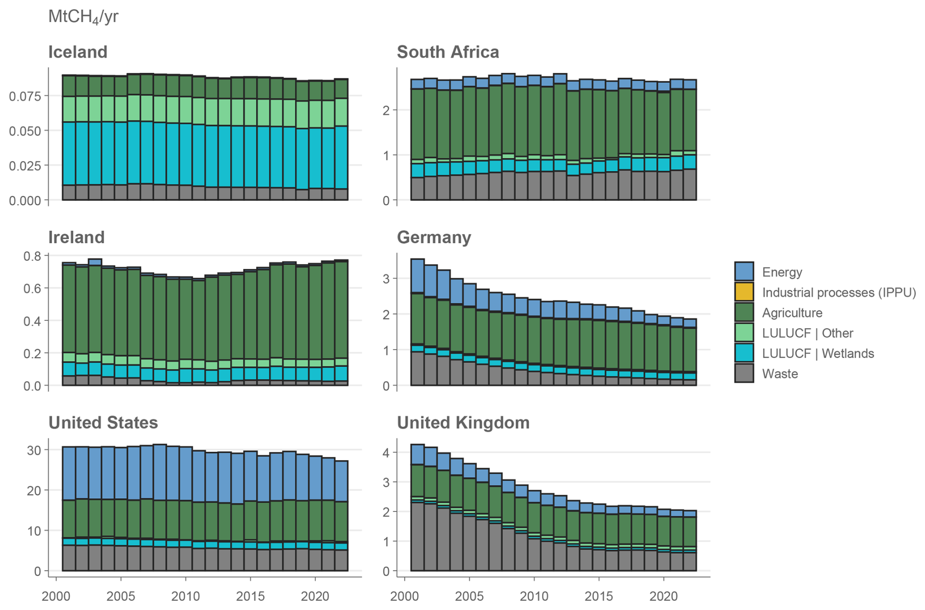 Figure 6Methane emissions in countries with high shares of wetland emissions. Data: National GHG inventories compiled by Lamb (2025).