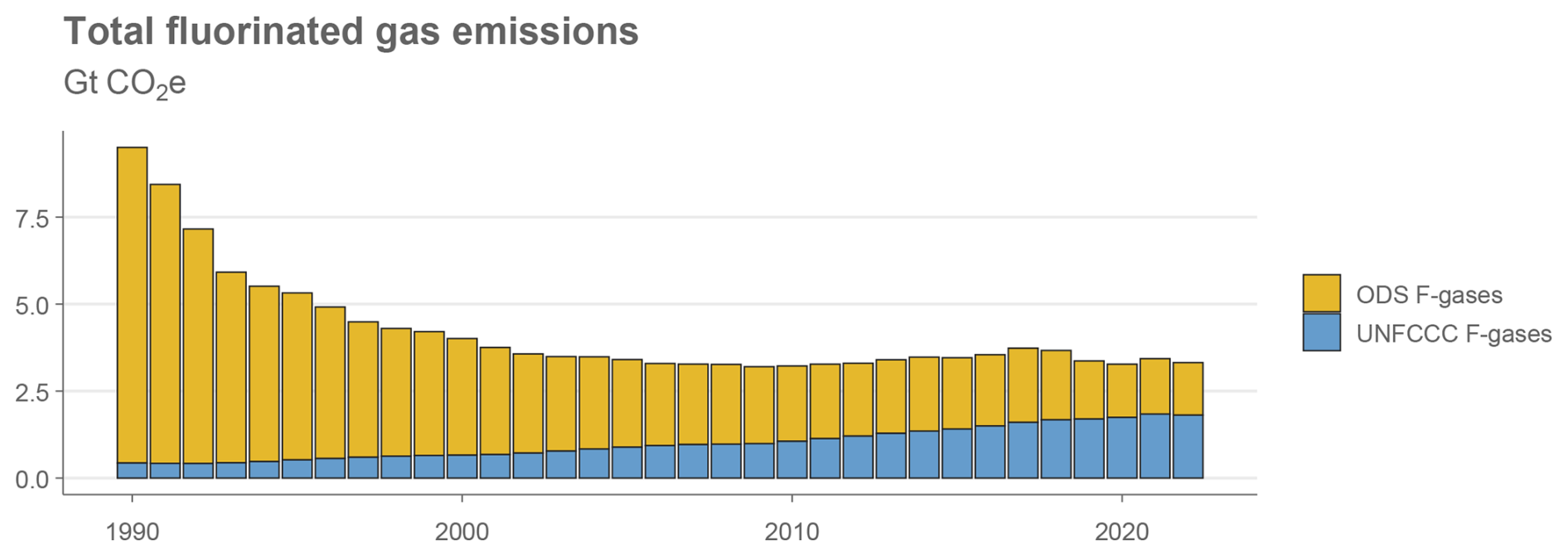 National inventory reporting and some third-party datasets include estimates of HFCs, PFCs, SF6 and NF3. We call these the “UNFCCC F-gases”. (As mentioned before, the UNFCCC F-gases plus CO2, CH4 and N2O are often referred to as the “Kyoto gases”). However, the UNFCCC F-gases do not cover chlorofluorocarbons (CFCs) and hydrochlorofluorocarbons (HCFCs). We call these two categories the Ozone Depleting Substances or “ODS F-gases”. The ODS F-gases also have high global warming potentials, but were already regulated under the 1987 Montreal Protocol and the subsequent Kigali amendment because of their impacts on the ozone layer.