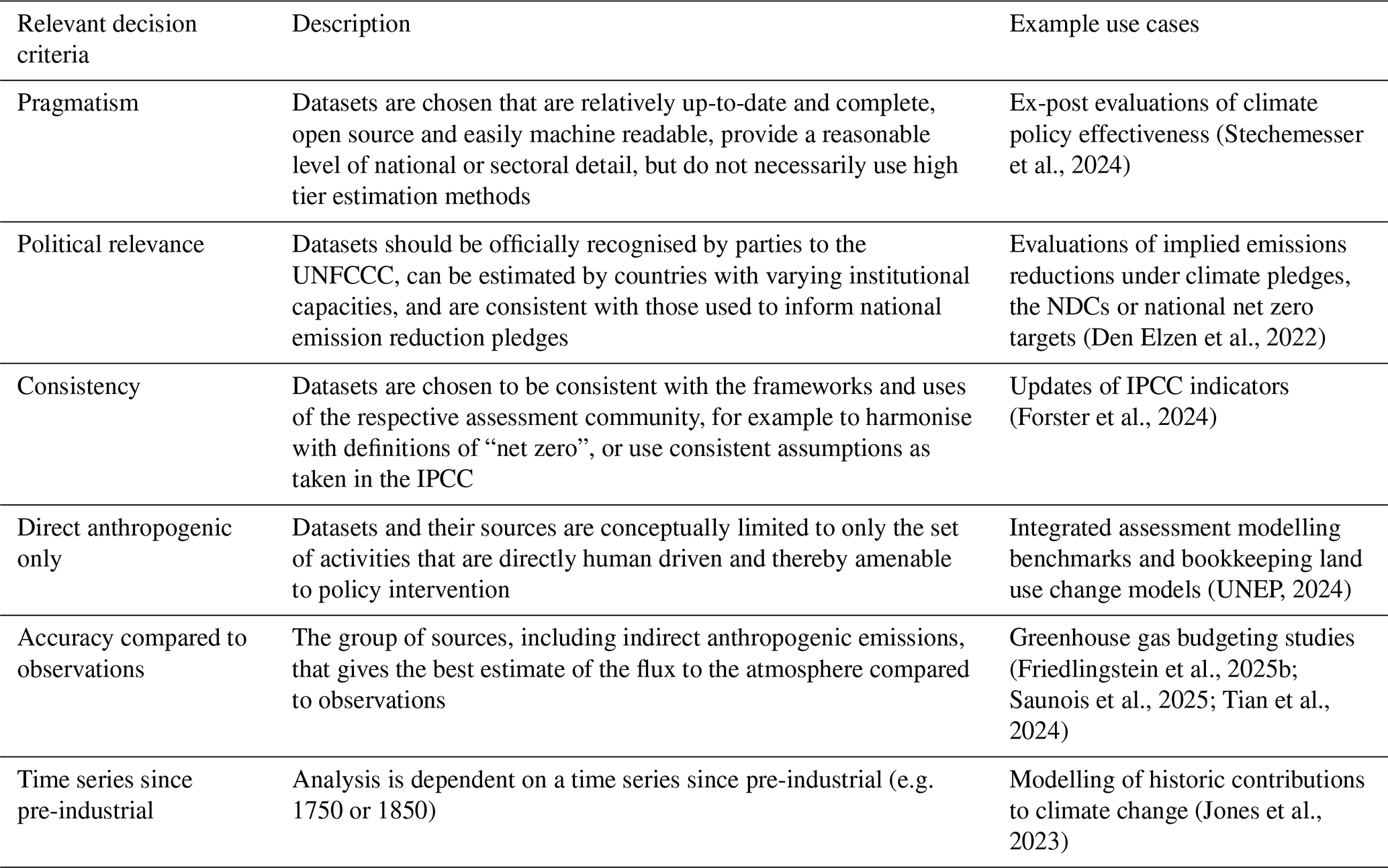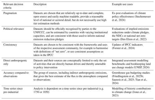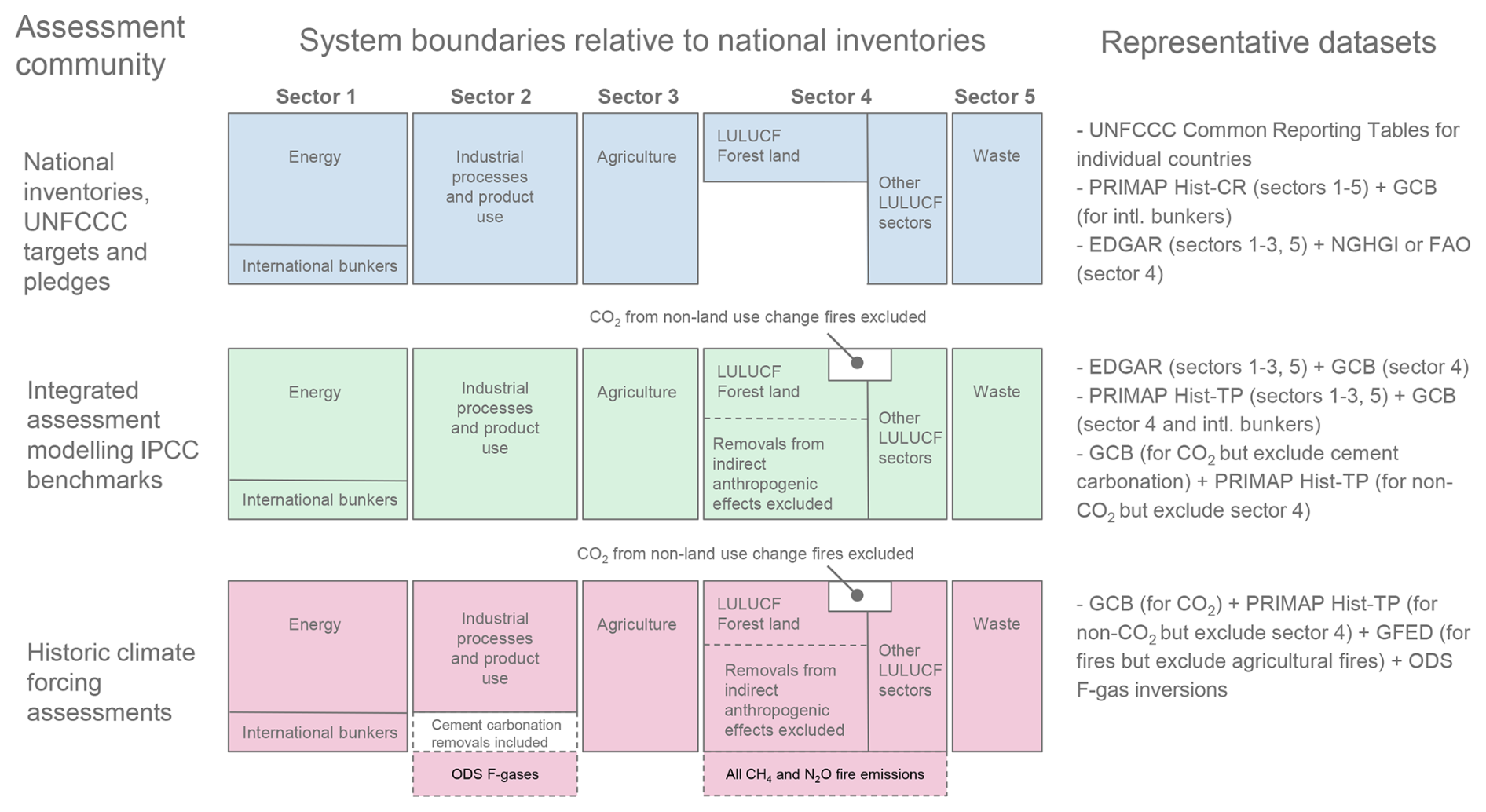 Since these assessments aim to get the best estimate of GHG fluxes to the atmosphere, they would consider non-Paris Agreement sources (ODS F-gases and cement carbonation) as well as all (non-CO2) fire emissions. (Note that aerosol precursor species and other short-lived climate forcers would also be considered relevant for these assessments). Removals due to natural sinks are generally not considered as input data, as they are modelled directly by the climate models themselves, partly because these sinks are functions of the climate state and hence are considered part of climate feedbacks. Additionally, climate modelling requires inputs starting from pre-industrial, usually 17- or 1850, meaning that long time series datasets are often prioritised. Unless studies are explicitly considering national boundaries or contributions to climate change (e.g. as in Jones et al., 2023), detailed national or sectoral data is usually not required. This relaxes some constraints on using top-down observational datasets (e.g. fire emissions observations, inversions of atmospheric concentrations), which often cannot be easily assigned to territorial boundaries. These considerations lead to a few key sources being used for historical emissions: the GCB for CO2, CEDS or PRIMAP Hist-TP datasets for CO2, CH4 and N2O emissions, the GFED dataset for CH4 and N2O from fires, and inversion datasets (e.g. Velders et al., 2015; WMO, 2022) for F-gases (both UNFCCC and ODS).