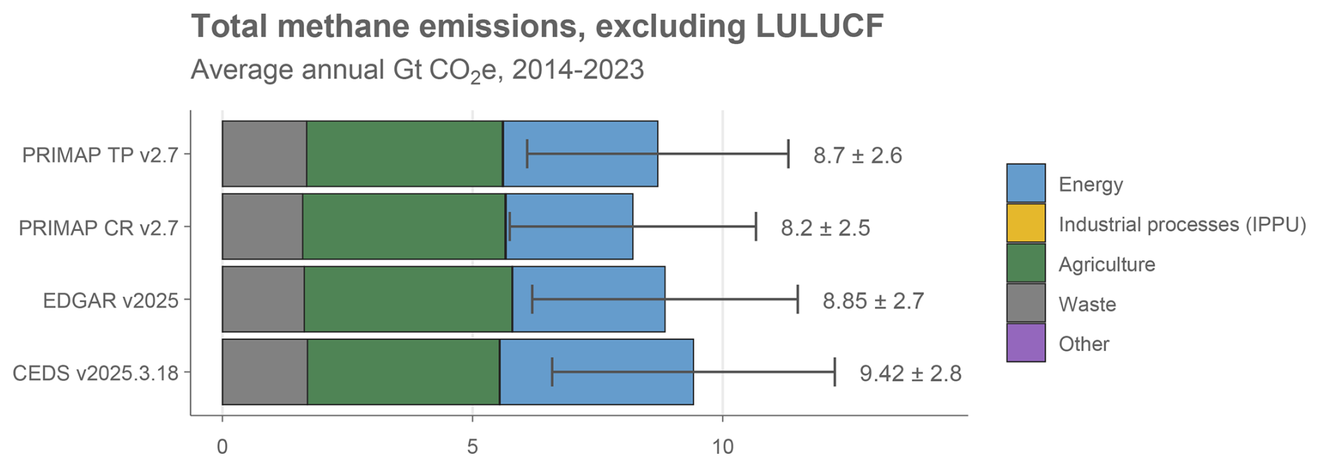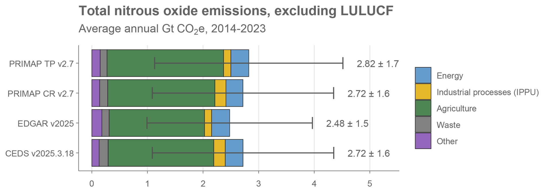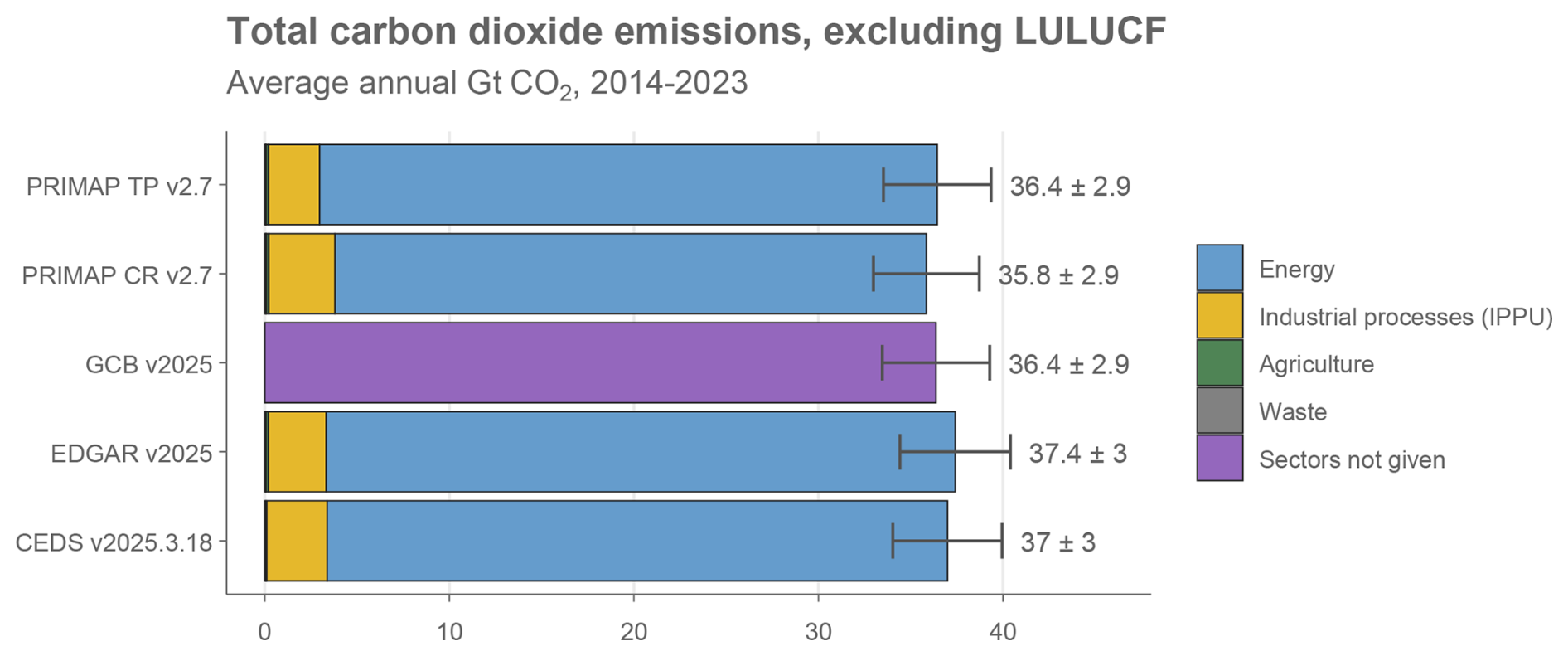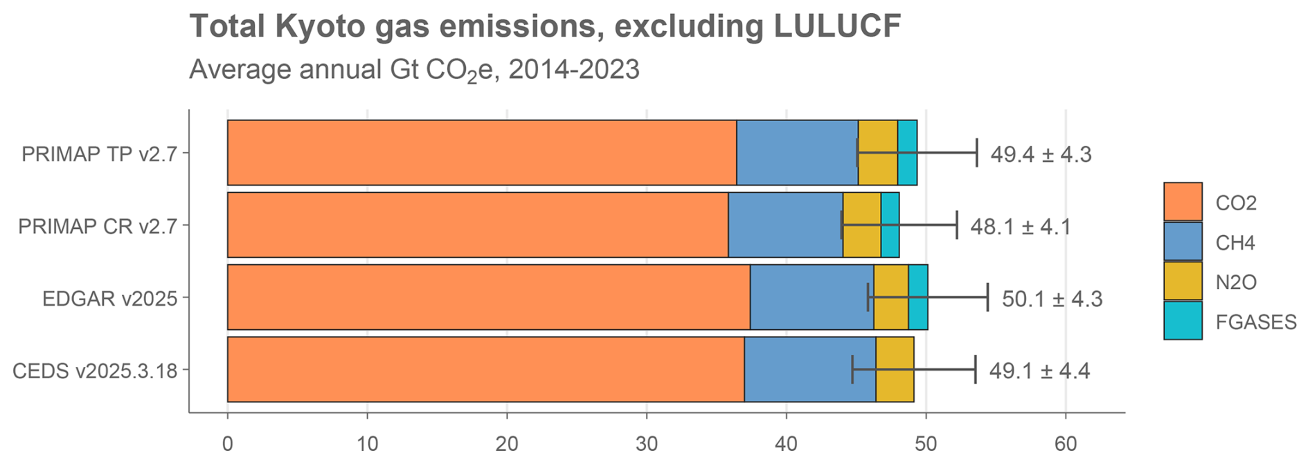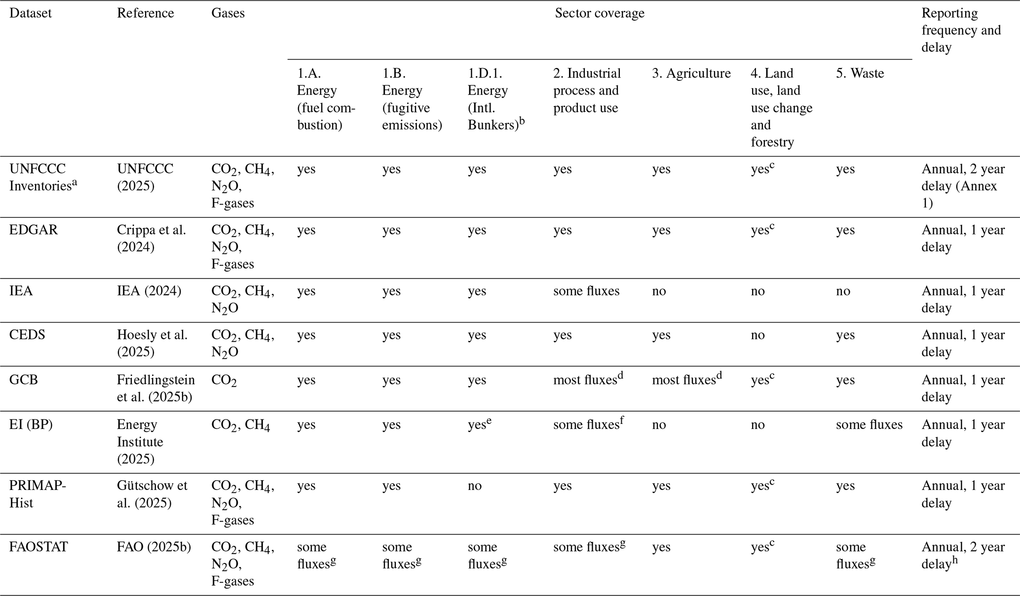 Consequently, third-party datasets produced by researchers and international institutes are frequently used to report global or national totals, including trends before 1990. These third-party datasets usually explicitly follow the inventory conventions for sectors and coverage of gases, but make use of national statistics for activity data and independently assessed emissions factors, often based on general default values (also known as “Tier 1” estimates). Key global datasets that cover multiple sectors and gases with a global scope include: the Emissions Database for Global Atmospheric Research (EDGAR) (Crippa et al., 2024; Janssens-Maenhout et al., 2019); the Community Earth atmospheric Data System (CEDS) (Hoesly et al., 2025); and the PRIMAP-hist national historical emissions time series (PRIMAP-Hist) (Gütschow et al., 2025). Some data sets focus on specific GHGs or sectors, including the Global Carbon Project's (GCP's) Global Carbon Budget (GCB) (Friedlingstein et al., 2025b), Global Methane Budget (Saunois et al., 2025) and Global Nitrous Oxide Budget (GNB) (Tian et al., 2024); the Energy Institute's Statistical Review of World Energy (EI – formerly published by BP) (Energy Institute, 2025); the International Energy Agency (IEA) GHG Emissions from Energy dataset (IEA, 2024), and the Food and Agriculture Organisation of the UN (FAOSTAT) Greenhouse Gas Emissions dataset (FAO, 2025b).