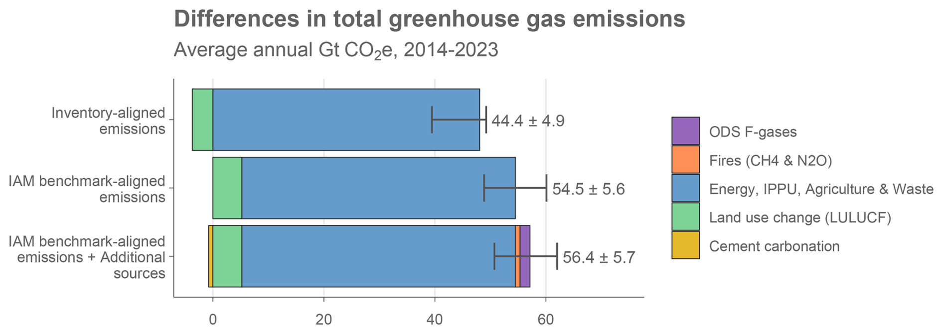 The third reason why GHG estimates can differ is that current UNFCCC guidance does not cover all climatically relevant sources of emissions and removals. This stems from the existence of other global environmental agreements and the fact that inventory reporting guidance is not as agile in updating its scope compared to the wider literature. And since inventories exclude certain sources and gases, this has a knock-on effect on third-party datasets that harmonise with the UNFCCC approach. Two major current omissions are ozone depleting F-gases and the cement carbonation sink.