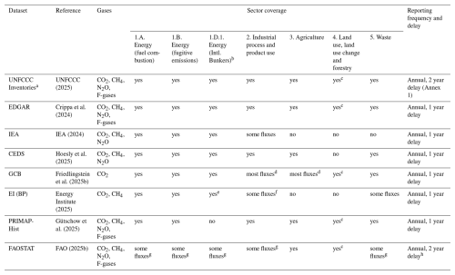 Table 1Bottom-up emissions datasets of anthropogenic GHG emissions and their characteristics. Several subcategories of the energy sector are shown to highlight their exclusion in some datasets. Datasets are named and referenced in Sect. 2.1. Notes: a Only Annex I countries reliably submit complete inventories each year. b Bunkers are included as a memo item in UNFCCC inventories (excluded from national totals), and typically as a separate “country” in other datasets. c Definitions of LULUCF differ, as discussed in Sect. 2.2. d For some countries, excludes lime, glass and other decomposition in sector 2, and liming in sector 3. e Included in national totals and not reported separately. f Includes cement only. g FAO includes agrifood system emissions across all sectors, and separately a version of the PRIMAP-Hist database for non-agrifood sectors. h Currently FAOSTAT is at T-0 for forest emissions and regularly at T-1 for peatland drainage and fire emissions. Adapted from Andrew (2020). Note that PRIMAP-Hist includes two datasets (Hist-CR and Hist-TP), which prioritise data from national inventories and third-party sources, respectively.