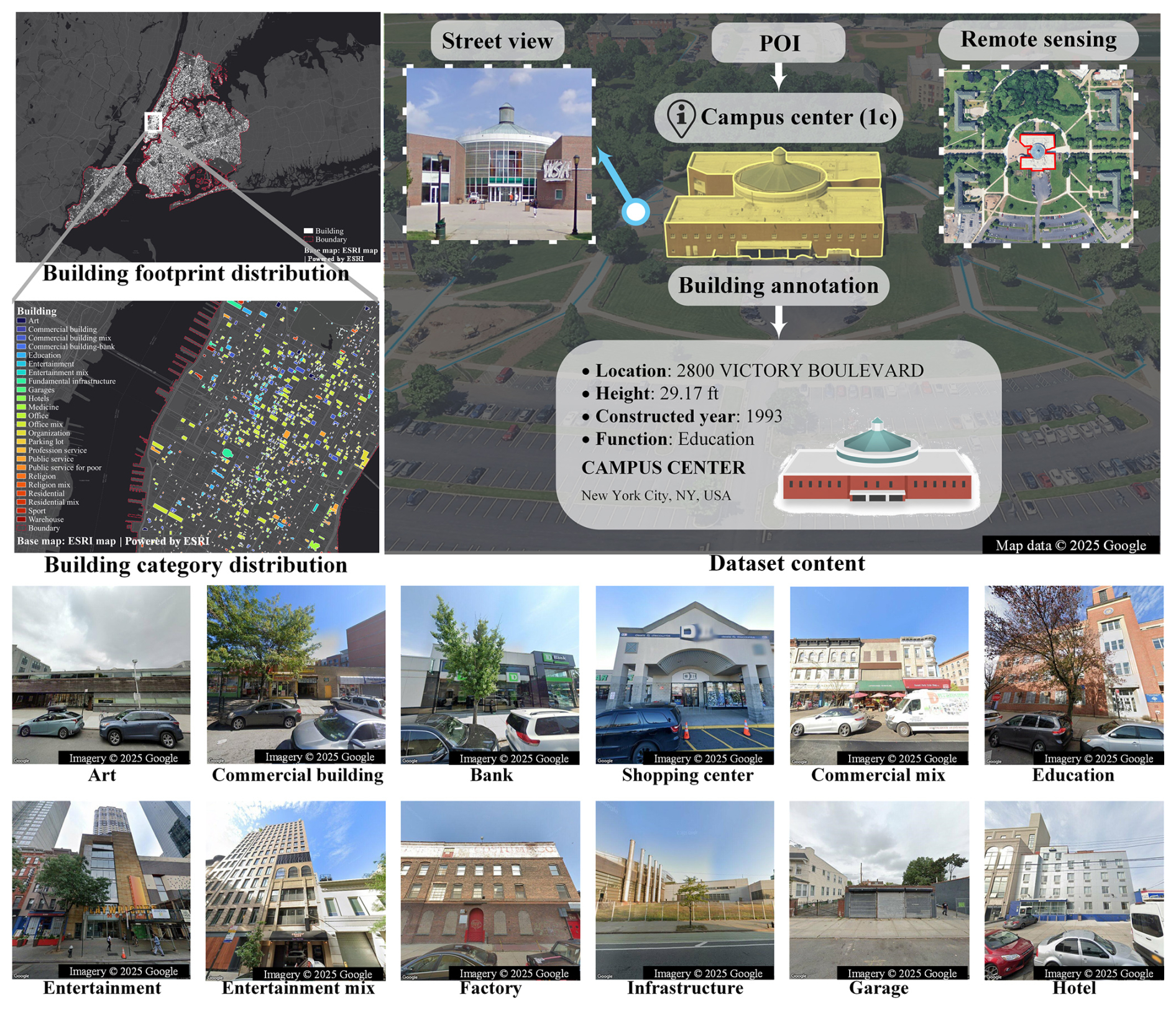Ultimately, based on our data collection and cleaning methods, we construct a multimodal and fine-grained building function classification dataset containing 34 458 building samples. In BuildingSense, each sample contains a corresponding ID, a footprint polygon, a street view imagery, a rooftop remote sensing imagery, a 60.96 m buffer zone remote sensing imagery, POIs, and annotation (including building height, constructed year, location, and function) (Fig. 7). As a training dataset, BuildingSense ensures data quality through three aspects: (1) consideration of sample categories and spatial distribution, (2) multimodal data matching and annotation verification, and (3) data completeness of individual building samples.