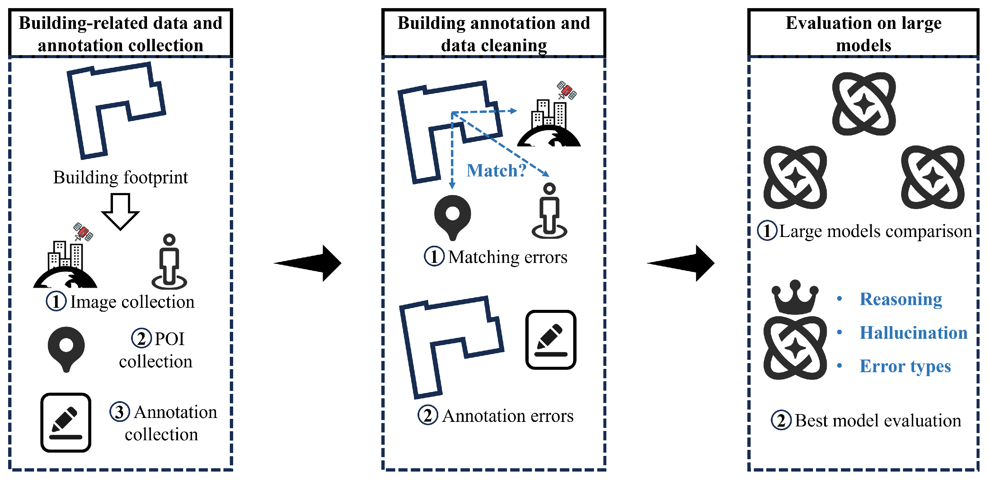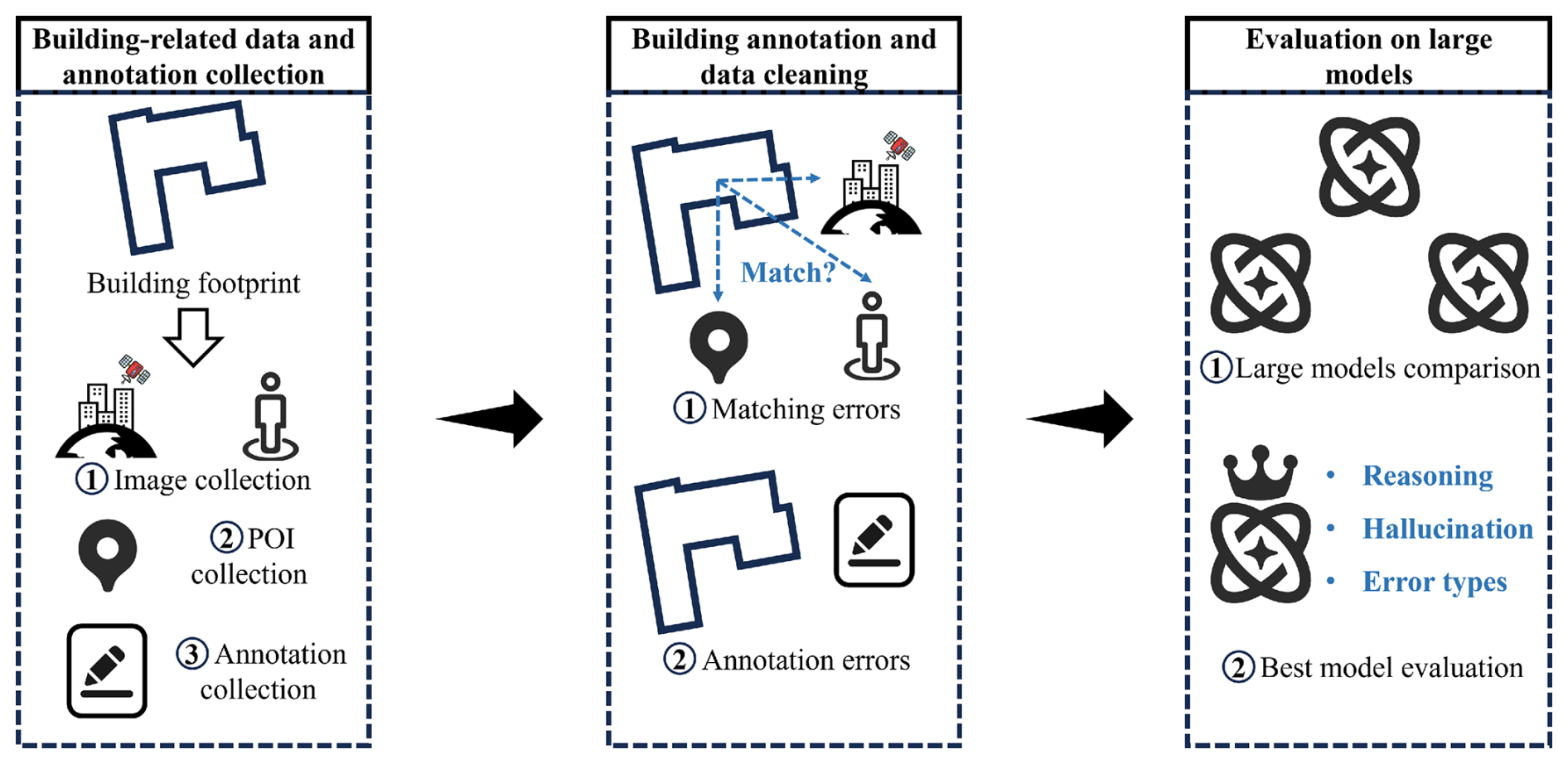 As illustrated in the Fig. 2, the methodological workflow of our dataset consists of three components: (1) building-related data and annotation collection, (2) building annotation and data cleaning, and (3) evaluation on large models. The first component describes how building footprints were sampled and how the relevant data and annotations were collected based on these footprints (Sect. 3.1). The second component details the cleaning process for the collected data and annotations, ultimately yielding a high-quality multimodal dataset (Sect. 3.2). The third component outlines the setup for baseline comparisons to evaluate the performance of different large models and the evaluation method for the optimal model (Sect. 3.3).