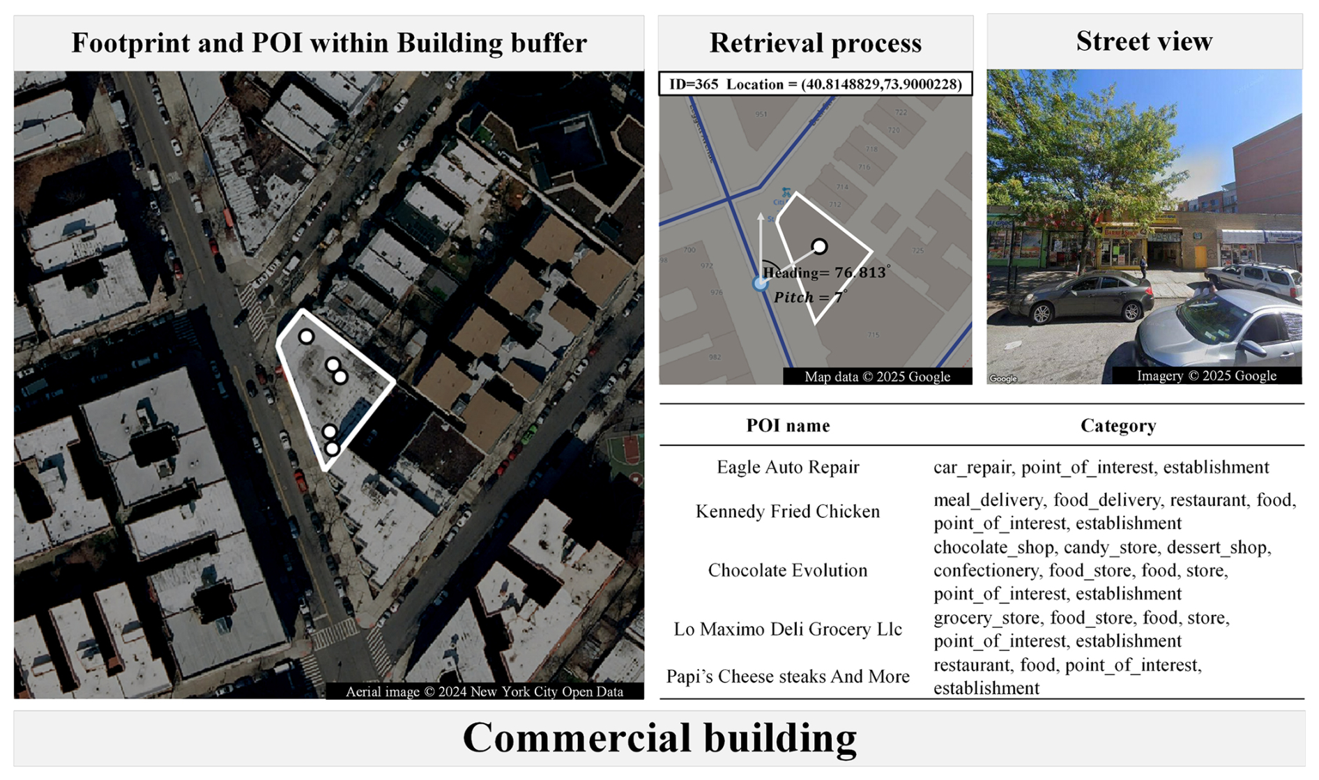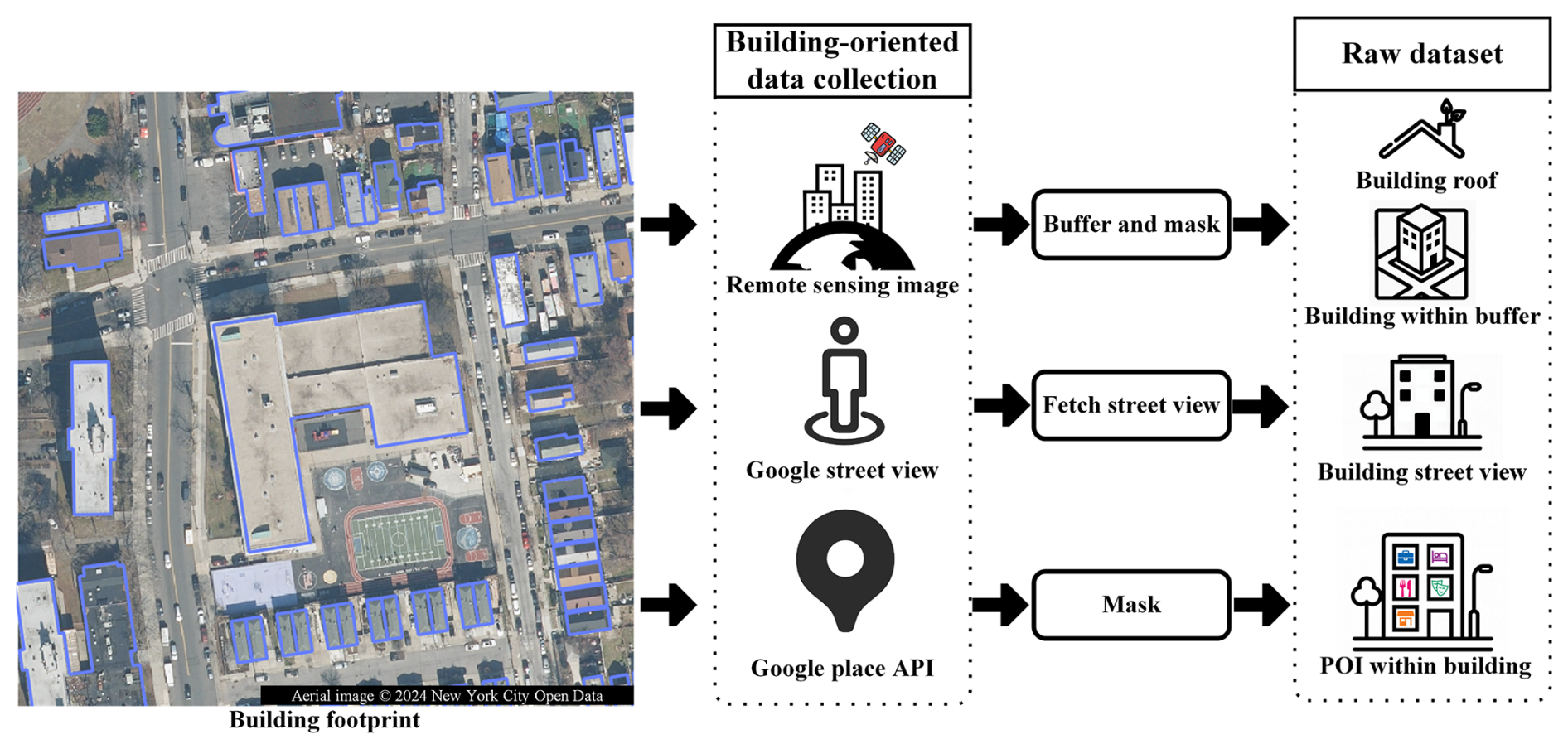 Figure 3Building-related remote sensing image, street view image, and POI data collection. An example of the raw dataset is shown in Fig. S4.