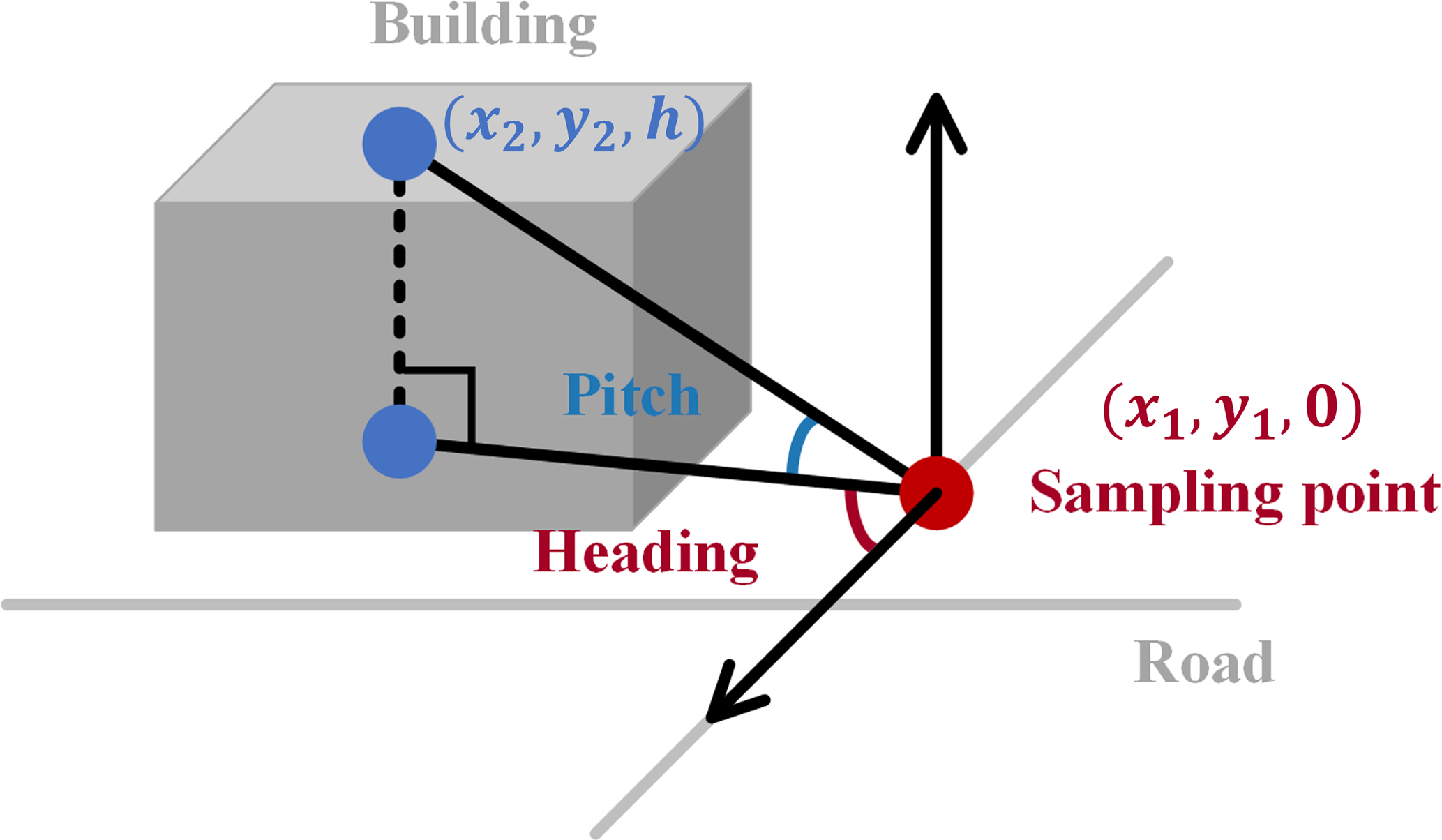 where (x1,y1) refers to the longitude and latitude position of the street view sampling point, (x2,y2) refers to the longitude and latitude position of the building center point, and h refers to the height of the building.